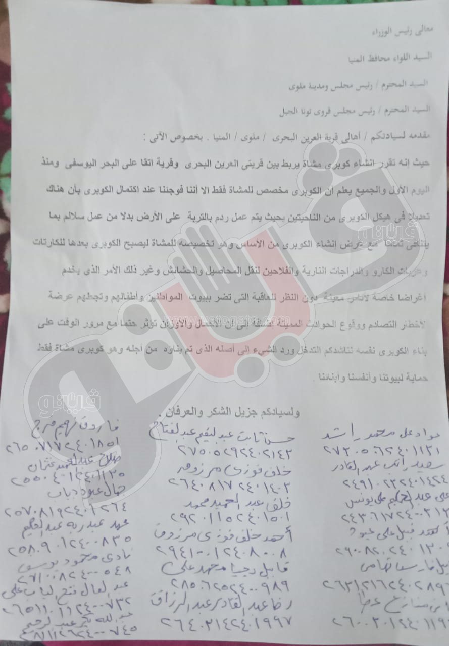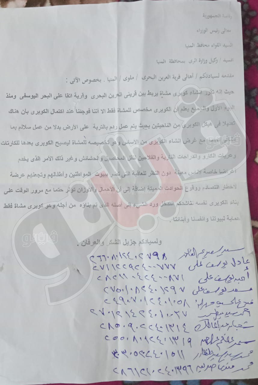 اشتكى أهالي قرية العرين البحري التابعة لمركز ملوي بمحافظة المنيا من محاولات البعض إجراء تعديلات على كوبري المشاة المقرر إنشائه ليربط بين قريتي العرين البحري وأتقا عبر البحر اليوسفي.