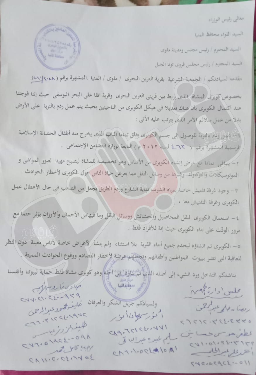 وأوضح أن الكوبري مقرر له من البداية أن يكون كوبري للمشاة؛ ولكن أهالي القرية فوجئوا بتدخلات البعض لتحويل الكوبري من كوبري مشاة إلى كوبري للعربات الكارو، والدراجات النارية، وفوجئنا بأعمال ردم تتم ما يعني أن هناك نية للتغيير في هيكل الكوبري ليتحول من كوبري مشاة إلى كوبري نقل، وهو ما ينذر بمخاطر كبيرة تهدد التجمعات السكنية والأطفال قرب منطقة الكوبري، فصلا عن أن ذلك الأمر قد يؤدي إلى تجمعات شبابية أعلى الكوبري مما يضر بالأسر الريفية قرب مكان الكوبري.