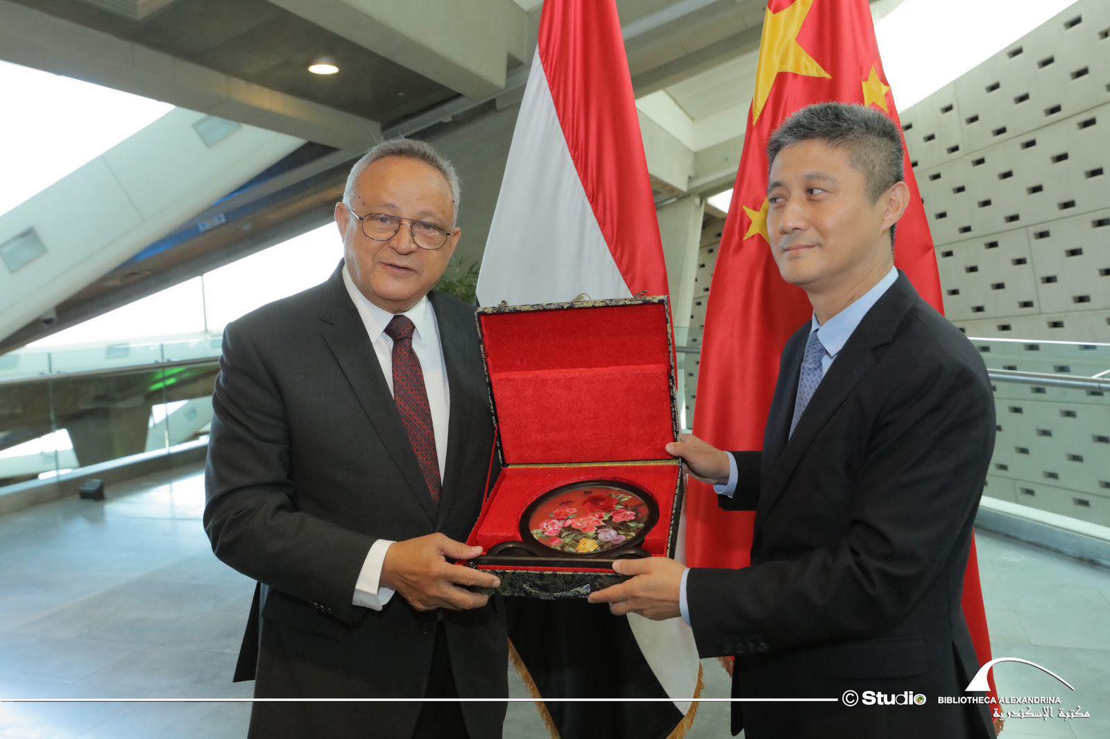 وقام الوفد بإهداء مكتبة الإسكندرية مجموعة إصدارات الرئيس الصيني "شي جين بينج" بلغات مختلفة.