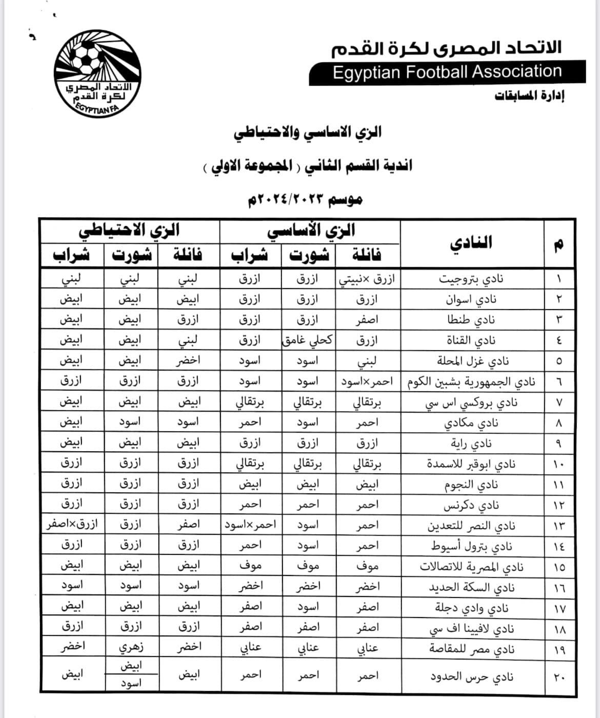 وأعلنت لجنة المسابقات باتحاد الكرة رسميا تفاصيل الزي الرسمي والاحتياطي للأندية المشاركة في دوري المحترفين موسم 2023-2024.