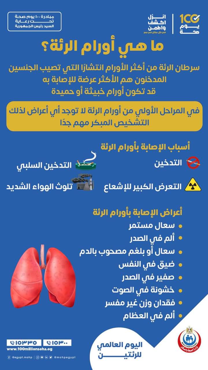 وأوضحت وزارة الصحة إن المدخنين هم الأكثر عرضة للإصابة بأورام الرئة وهي قد تكون أوراما خبيثة أو حميدة.