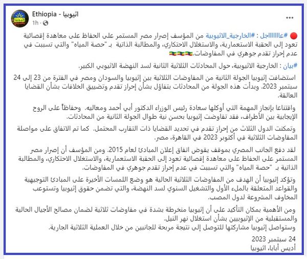 وكتب أستاذ الموارد المائية بجامعة القاهرة، منشورا على حسابه بموقع التواصل الاجتماعي "فيس بوك": "إثيوبيا أعلنت يوم 25 سبتمبر بيانا بعد انتهاء اجتماعات أديس أبابا 23-24 سبتمبر 2023، ردا على البيان المصري بتاريخ 24 سبتمبر 2023، والذي ذكرت فيه أن الاجتماعات لم تسفر عن تقدم، وأن هناك تراجعا إثيوبيا في بعض الموافقات السابقة".
