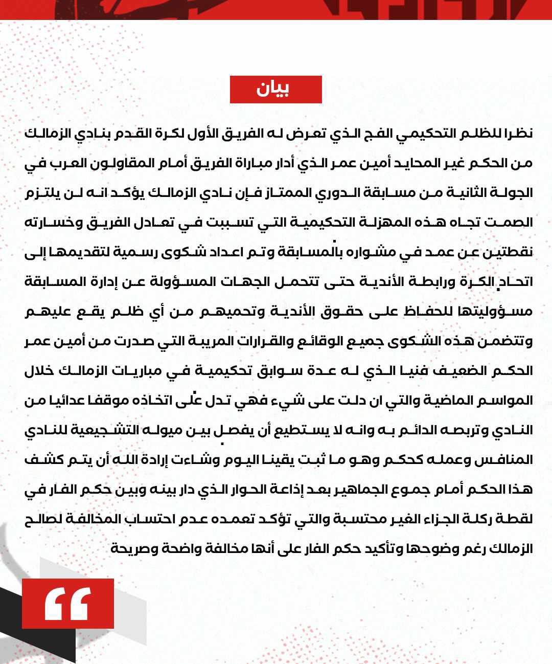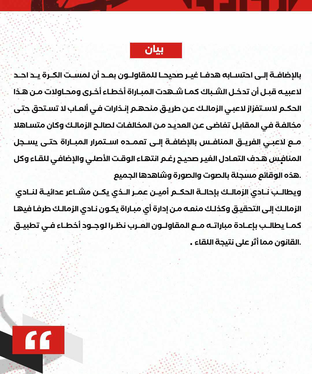 أصدر نادي الزمالك، بيانا رسميا يطلب من خلال إعادة مباراة المقاولون بسبب الظلم التحكيمي.