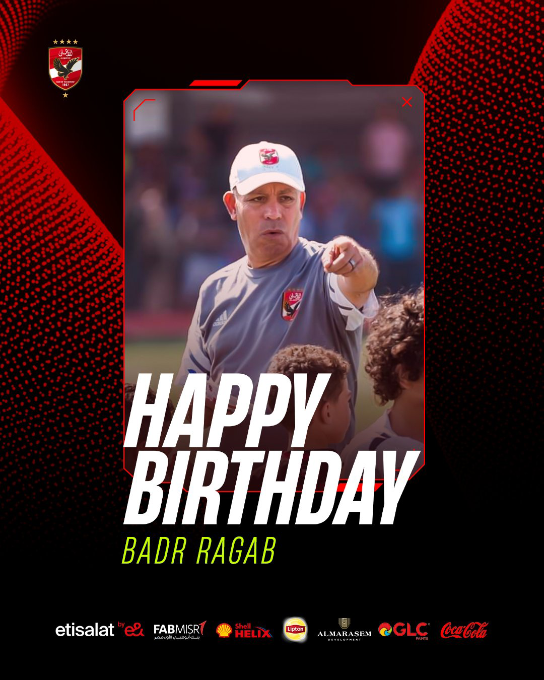 الأهلى، حرص الحساب الرسمي للنادي الأهلي عبر موقع التواصل الاجتماعي فيس بوك على الاحتفال بعيد ميلاد بدر رجب رئيس قطاع الناشئين بالنادي ونجم الفريق الأول لكرة القدم بالنادي السابق الذي احتفل بعيد ميلاده ال60 اليوم الثلاثاء فهو من مواليد 26 سبتمبر من العام 1963 بمحافظة القاهرة.