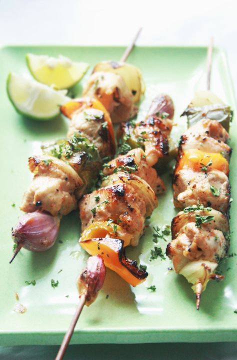 ثم توضع قطع الدجاج فى اسياخ الشيش طاووق مع الفلفل والبصل وتكرر العملية.