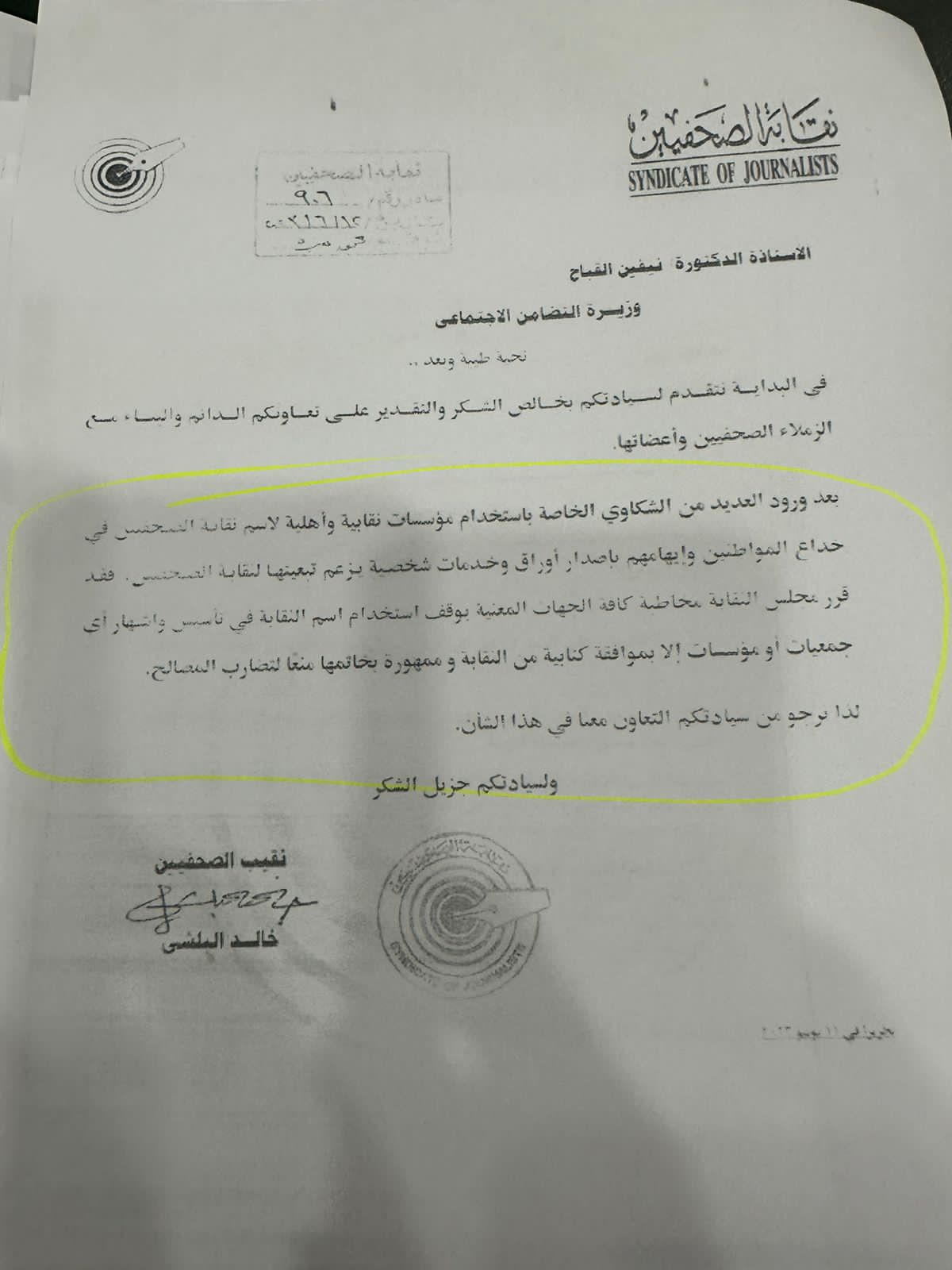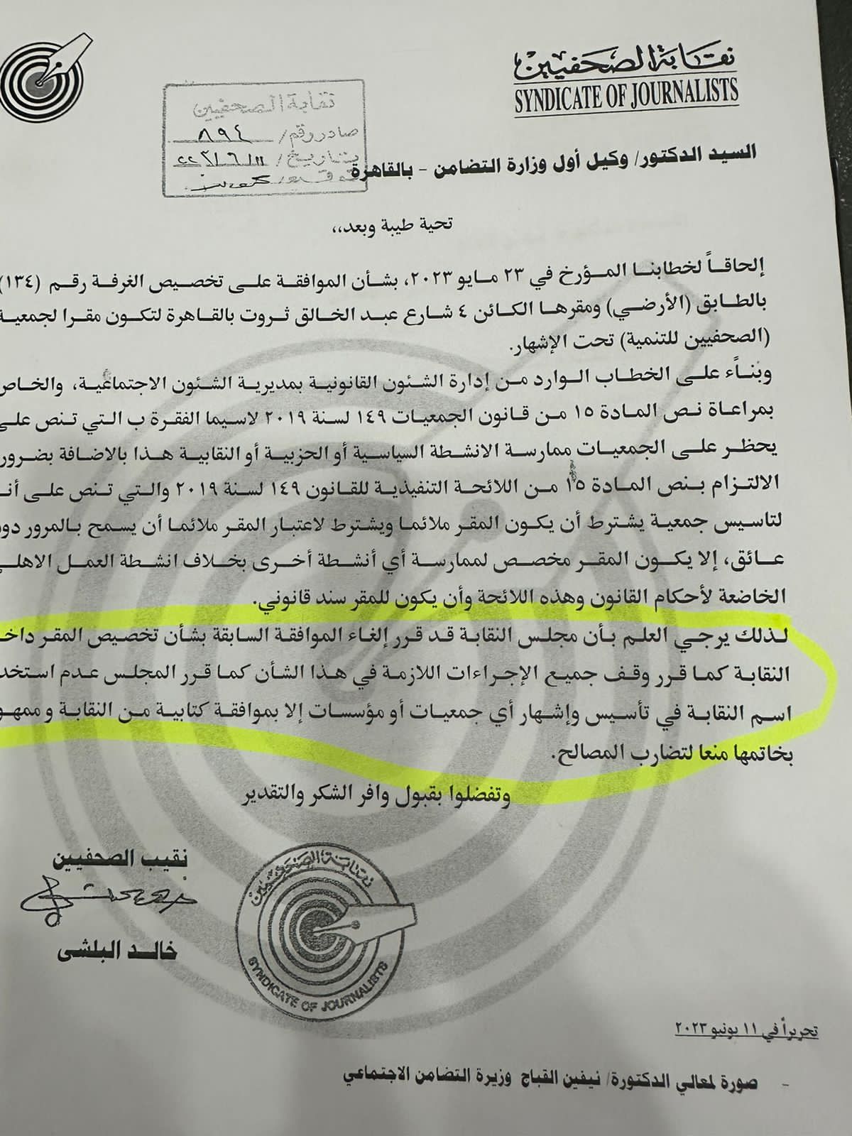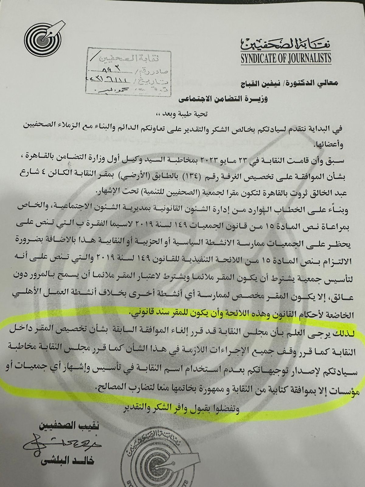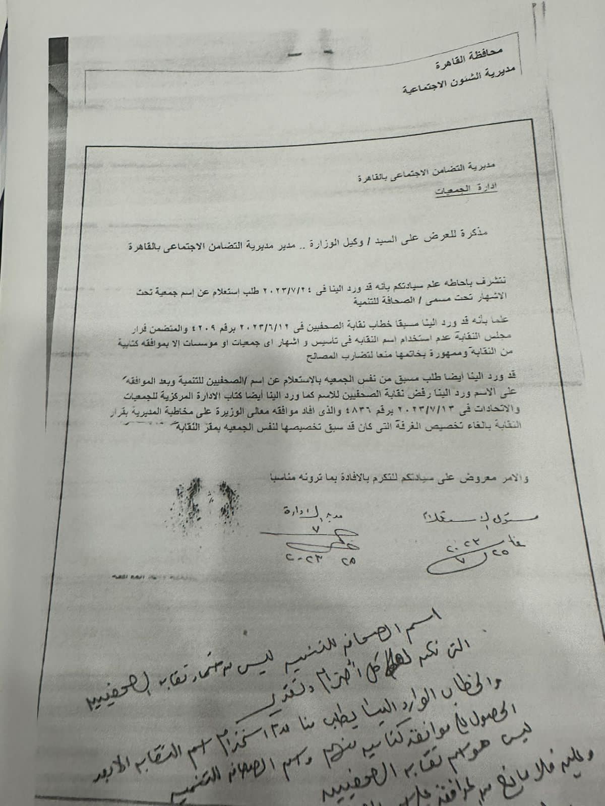 قبل يومين، فوجئنا بالزميل يعلن عن جمعيته الغريبة، التى كنا قد اتخذنا قرارًا بوقفها، وأرسلنا مخاطبات بذلك، وبإلغاء الموافقة السابقة، وللتحايل على قرار المجلس بوقف أى جمعيات تحمل اسم الصحفيين حصل على ترخيصها باسم جمعية الصحافة، يوليو 2023 وهو ما يظهر فى التأشيرة المرفقة على الخطاب الثانى.