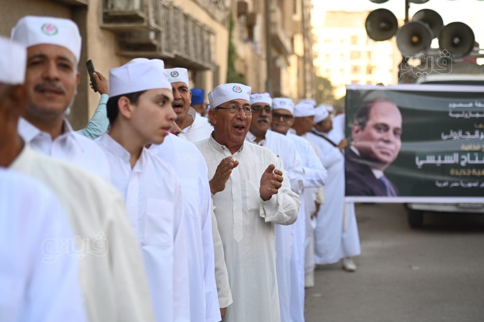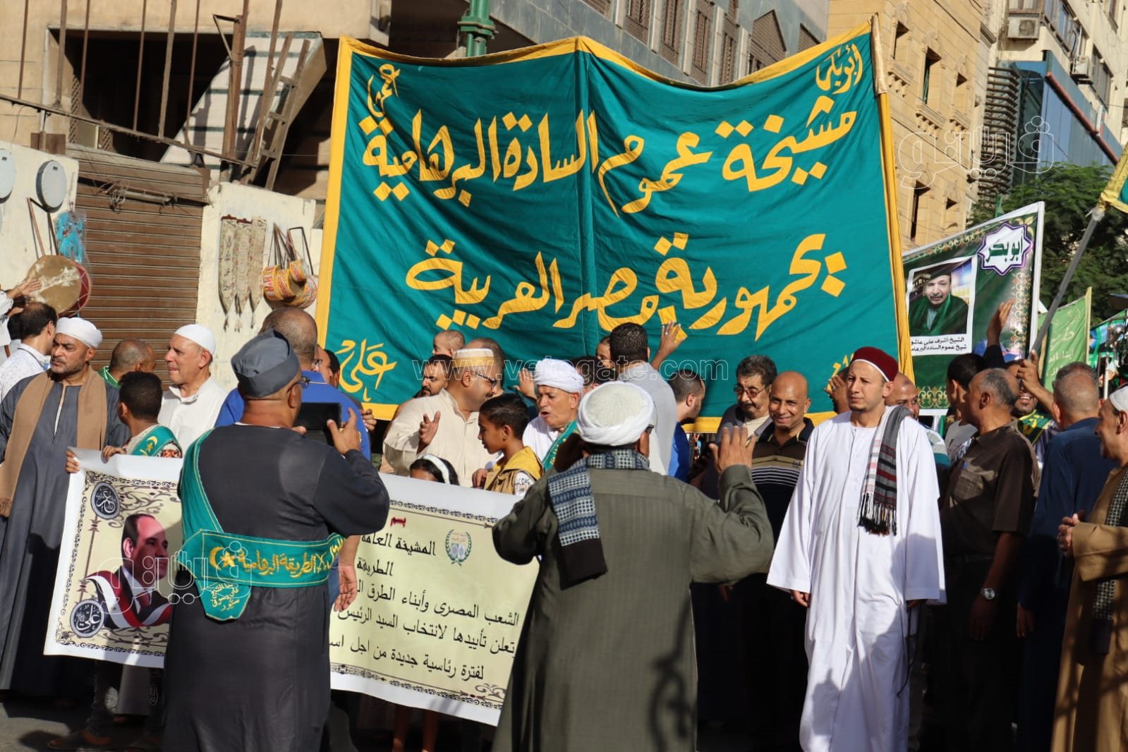 وقد رصدت عدسة " فيتو" عددا من الطرق الصوفية رافعة، لافتات مؤيدة لترشح الرئيس عبد الفتاح السيسي لولاية جديدة بانتخابات الرئاسة 2024، وذلك خلال تجمعهم أمام مسجد الشيخ صالح الجعفري، بل وخلال احتفالهم بداخل مسجد الحسين.