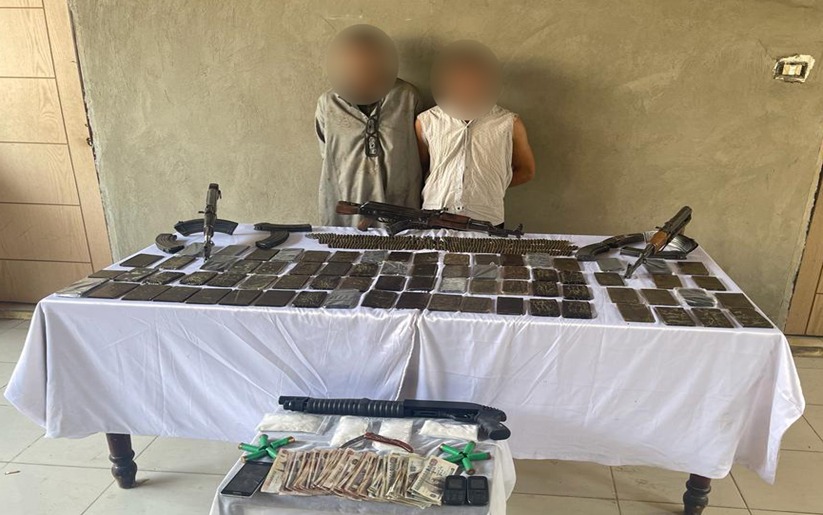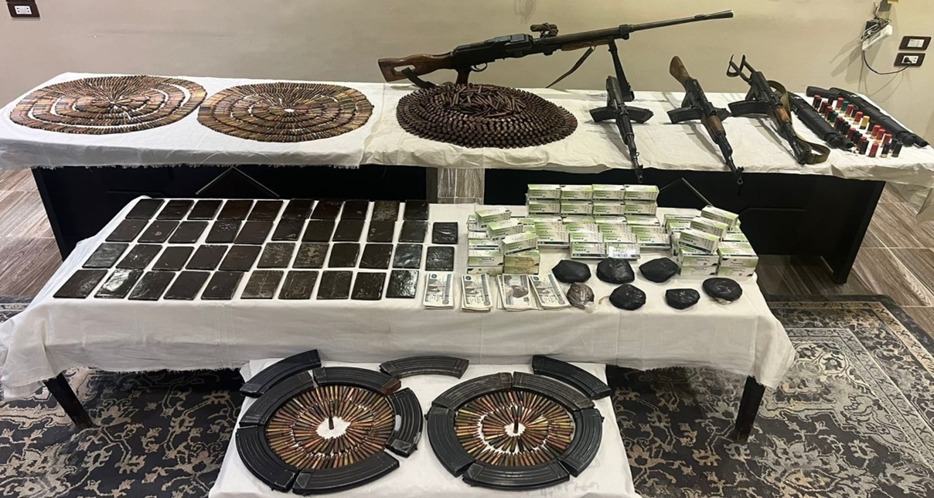 وضبط إثنين آخرين وعُثر معهم على (رشاش جرينوف – 6 بنادق آلية – 3 بنادق خرطوش- 25 خزينة وعدد من الطلقات مختلفة الأعيرة - كمية لمخدر الحشيش وزنت 11,700 كيلو جرام - كمية لمخدر الأفيون وزنت 4 كيلو جرام - كمية من مخدر الشبو وزنت كيلو جرام - 8000 قرص مخدر - سلاح أبيض – مبلغ مالي).