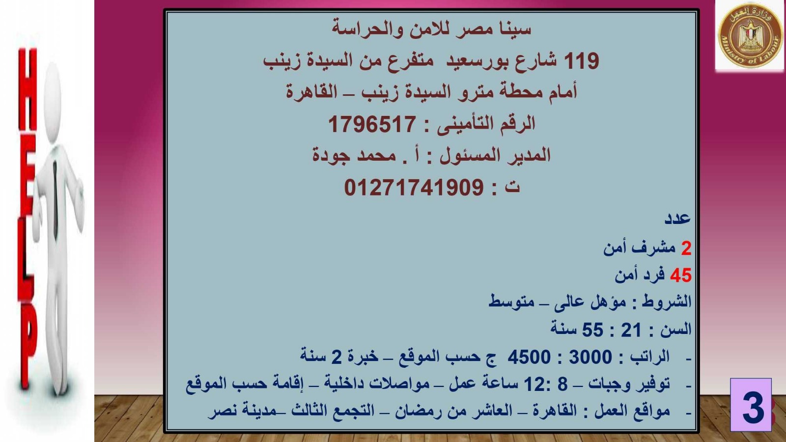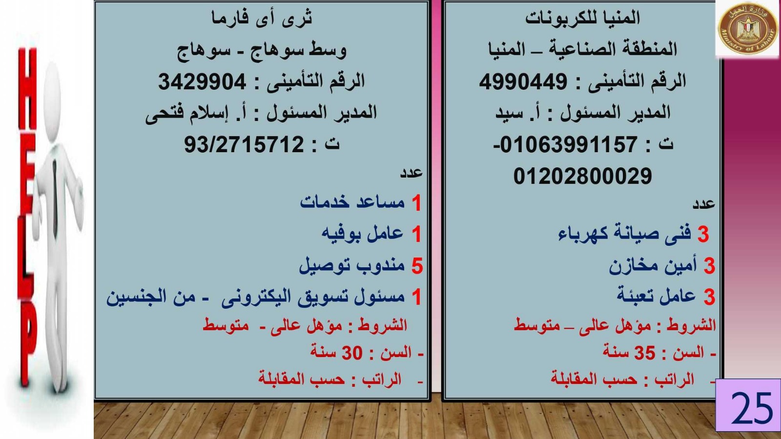 وجاء في البيان الصحفي،أن نشرة التوظيف الدورية تصدر عن "الوزارة" كل 15 يوم، من خلال الإدارة العامة للتشغيل برئاسة هبه أحمد مدير عام التشغيل بالوزارة، وإعداد منى شوقي باحث أول بالإدارة، تُعلن اليوم عن فرص عمل جديدة،متوفرة في 11 محافظة، هي:القاهرة، والجيزة، والإسماعيلية، وسوهاج، ودمياط، والقليوبية، وأسيوط، وقنا، والغربية، والمنوفية، والمنيا.