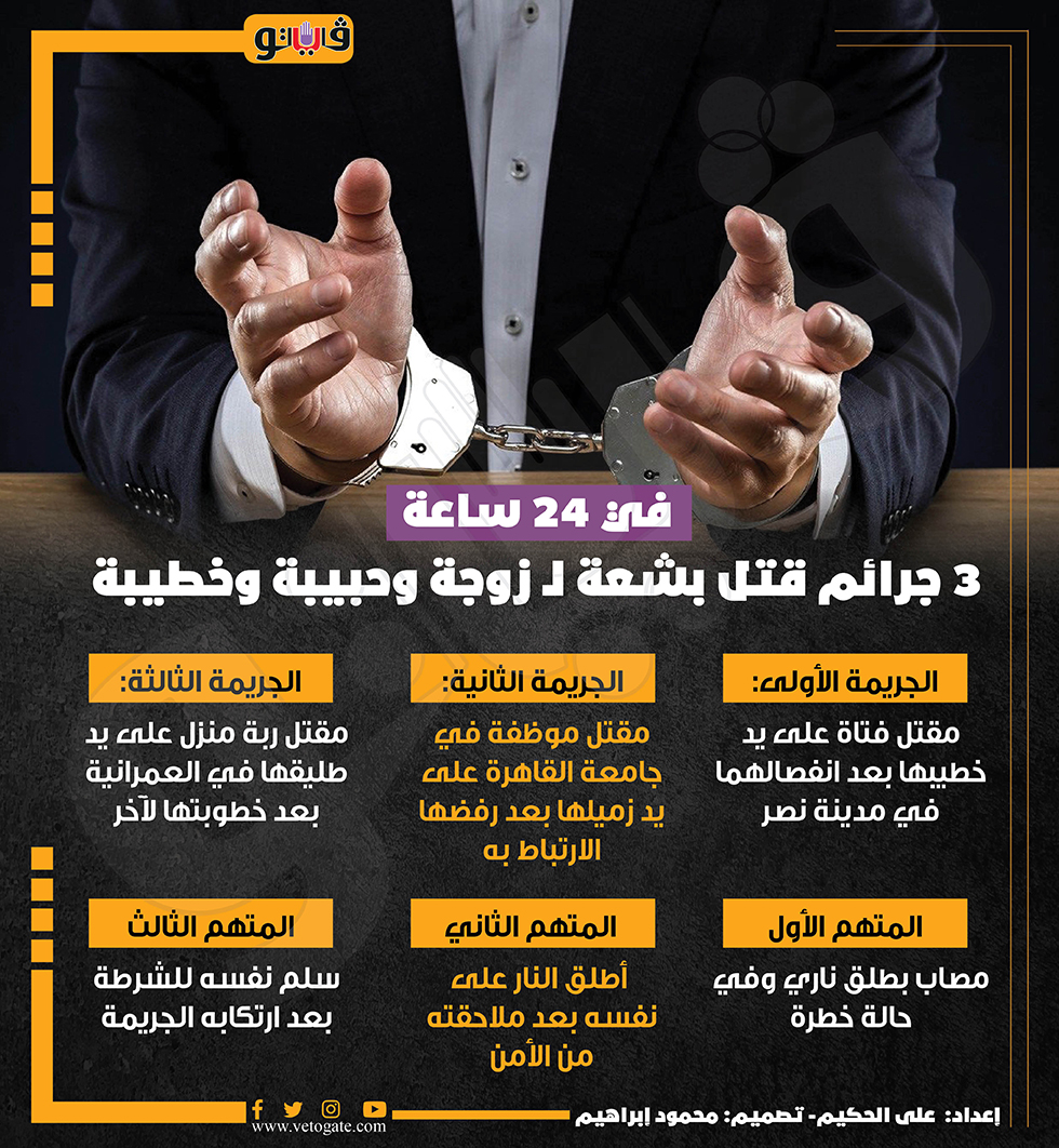 في 24 ساعة، 3 جرائم قتل بشعة لـ زوجة وحبيبة وخطيبة (إنفوجراف) الخميس 28/سبتمبر/2023 - 02:31 م 9/28/2023 2:31:34 PM حبس، فيتو على الحكيم شارك طباعة 18 حجم الخط شارك طباعة جامعة القاهرة مقتل موظفة في جامعة القاهرة العمرانية مدينة نصر