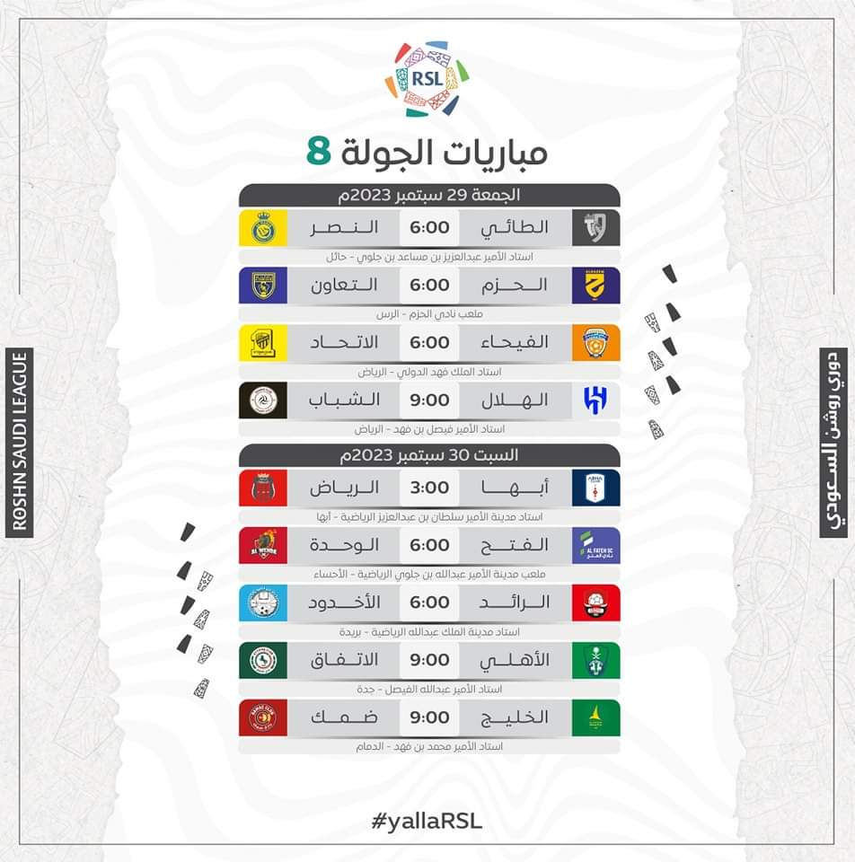 الهلال ضد الشباب، مواعيد مباريات الجولة الثامنة من الدوري السعودي
