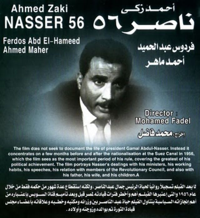 والفيلم من إنتاج قطاع الإنتاج باتحاد الإذاعة والتليفزيون ومن إخراج محمد فاضل ومن تأليف محفوظ عبد الرحمن وموسيقى ياسر عبد الرحمن وبطولة الفنان الراحل أحمد زكي، وفردوس عبد الحميد التي جسدت شخصية السيدة تحية كاظم زوجة الرئيس، وأمينة رزق وحسن حسني وأحمد خليل وعادل هاشم، ولقد عرض فيلم ناصر ٥٦ في أغسطس ١٩٩٦ وذلك فى افتتاح مهرجان الإذاعة والتليفزيون، وفى ليلة عرض الفيلم المهرجان انتاب الحاضرين حالة من البكاء.