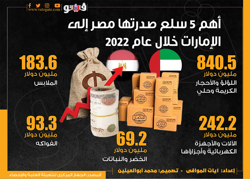 أهم 5 سلع صدرتها مصر إلى الإمارات خلال عام 2022 (انفوجراف) الجمعة 29/سبتمبر/2023 - 10:13 م 9/29/2023 10:13:17 PM صورة ارشيفية، فيتو آيات الموافى شارك طباعة 18 حجم الخط شارك طباعة الإمارات مصر والامارات حجم التبادل التجاري بين مصر والإمارات الصادرات المصرية للإمارات الاحجار الكريمة الاجهزة الكهربائية