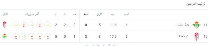 يحتل ريال بيتيس المركز الحادي عشر برصيد 8 نقاط، بينما يتواجد غرناطة في المركز قبل الأخير برصيد 3 نقاط.