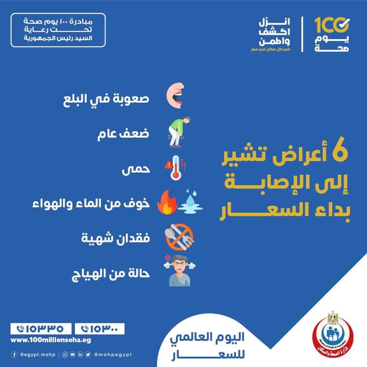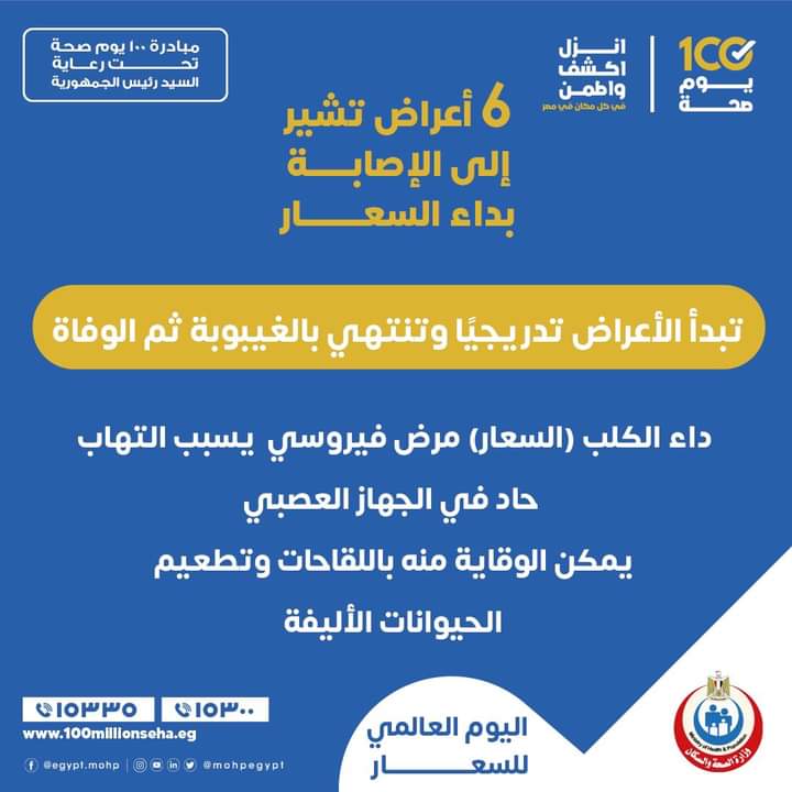 واوضحت وزارة الصحة ان مرض السعار تظهر أعراضه تدريجيا ثم غيبوبة ثم تحدث الوفاة وهو مرض فيروسي يسبب التهاب حاد في الجهاز العصبي ويمكن للوقاية منه بالحصول علي التطعيم.