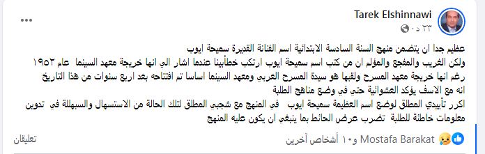 وقال “الشناوي” عبر صفحته الشخصية “فيس بوك”:"عظيم جدا أن يتضمن منهج السنة السادسة الابتدائية اسم الفنانة القديرة سميحة أيوب لكن الغريب والمفجع والمؤلم أن من كتب اسم سميحة ايوب ارتكب خطأ بينا عندما أشار إلى أنها خريجة معهد السينما عام ١٩٥٢، رغم أنها خريجة معهد المسرح ولقبها هو سيدة المسرح العربي".