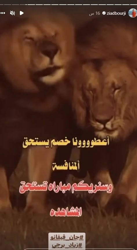 في هذا السياق، نشر زياد برجي منشورًا عبر حسابه الشخصي موقع انستجرام، جاء فيه: أعطونا خصم يستحق المنافسة، وسنريكم مباراة تستحق المشاهدة.