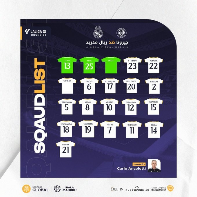 أعلن الإيطالي كارلو أنشيلوتي المدير الفني لفريق ريال مدريد عن قائمة فريقه ، استعدادا لمواجهة جيرونا غدا السبت في الجولة الثامنة من الليجا الإسبانية ،علي ملعب سانتياجو برنابيو معقل فريق ريال مدريد.