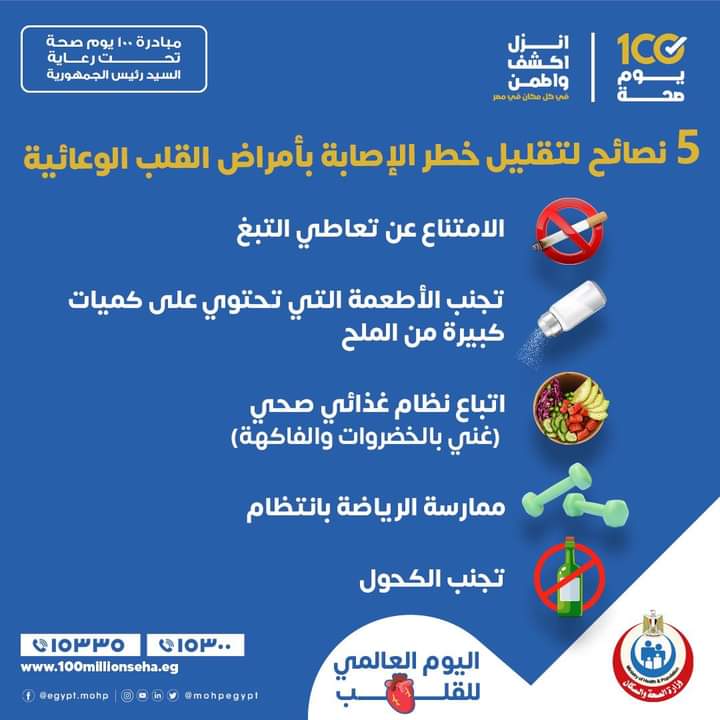 وجهت وزارة الصحة 5 نصائح لتقليل خطر الإصابة بأمراض القلب الوعائية، وذلك خلال اليوم العالمي للقلب الذي يتم إحياؤه في ٢٩ سبتمبر سنويا للتوعية بأمراض القلب.
