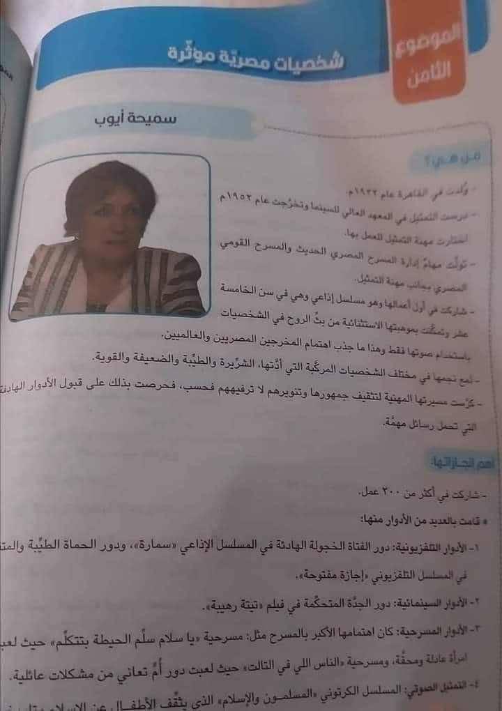 وكان رواد مواقع التواصل الاجتماعي تداولوا في الساعات الماضية إحدى الصفحات من منهج الصف السادس الابتدائي يتضمن مسيرة الفنانة سميحة أيوب سيدة المسرح العربي تحت عنوان "شخصيات مصرية مؤثرة".