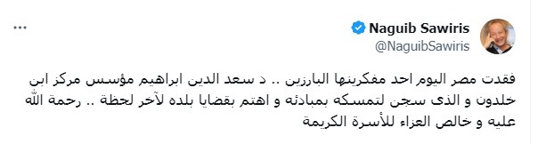 وكتب مهندس نجيب ساويرس تغريدة عبر "تويتر"، منصة أكس الحالية "فقدت مصر اليوم أحد مفكريها البارزين.. د سعد الدين إبراهيم مؤسس مركز ابن خلدون والذى سجن لتمسكه بمبادئه واهتم بقضايا بلده لآخر لحظة.. رحمة الله عليه وخالص العزاء للأسرة الكريمة".
