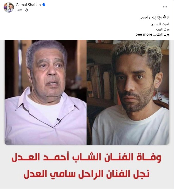 وكتب الدكتور جمال شعبان عن وفاة نجل سامي العدل فقال: "إنا لله وإنا إليه راجعون.. الموت المفاجيء، موت الغفلة، موت البغتة والتوقف القلبي المفاجئ، ظاهرة العصر ومن علامات آخر الزمان رحم الله الفقيد"