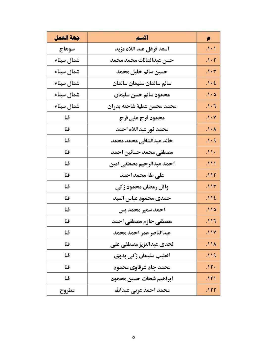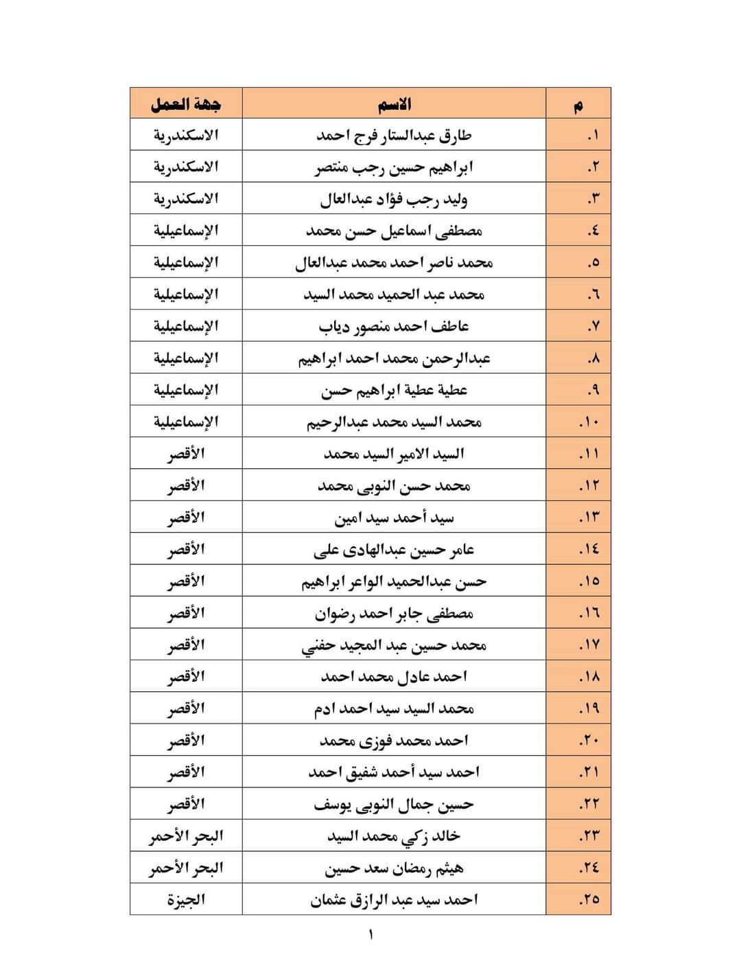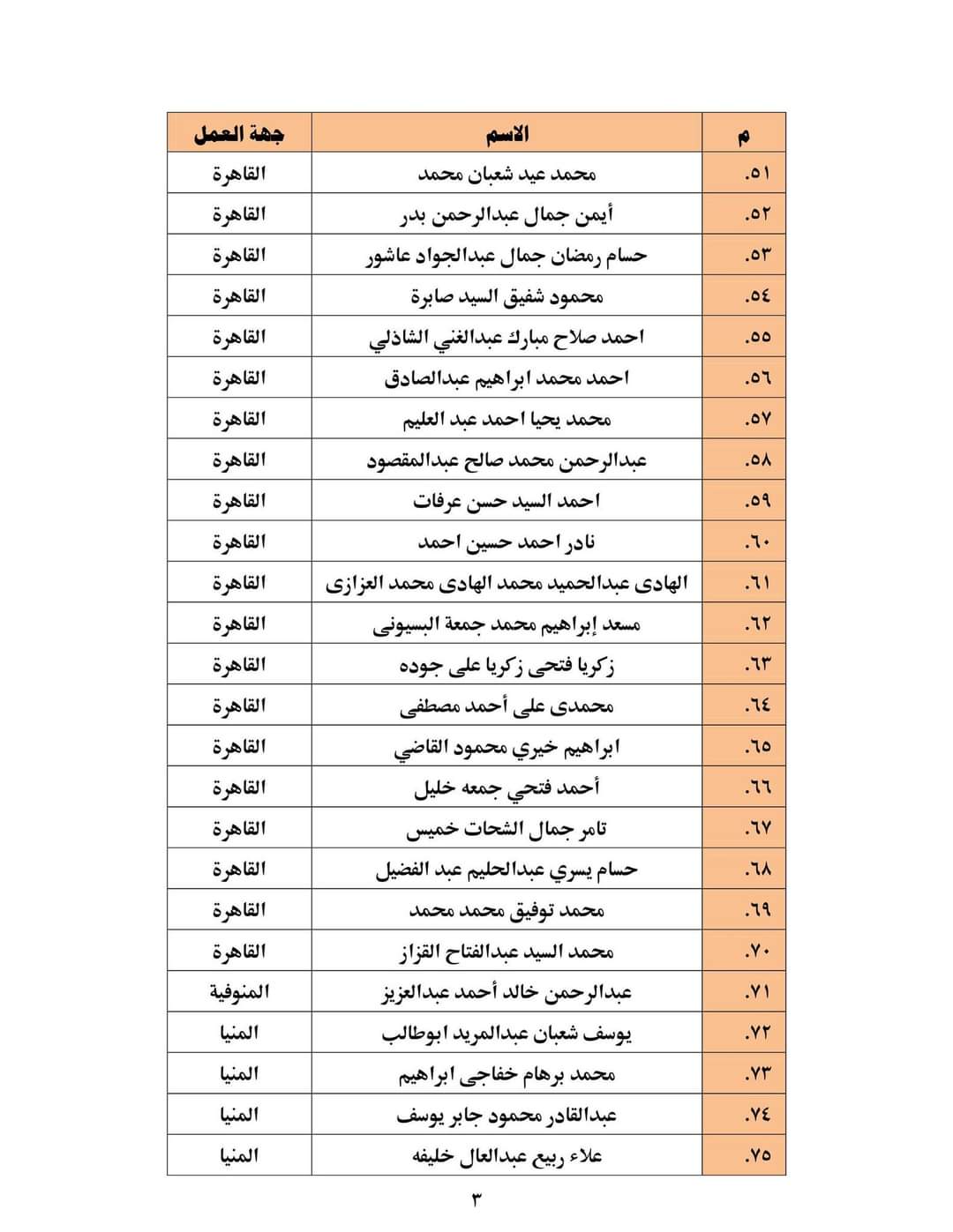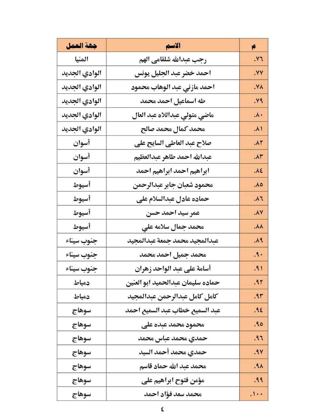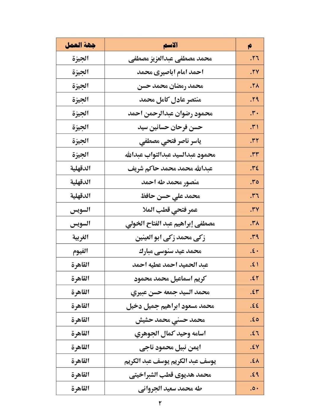 نشرت وزارة الأوقاف، أسماء المجموعة الثانية من العمال الذين استوفوا أوراق تسلمهم العمل، وحصلوا على الدورة التدريبية بالمديريات الإقليمية، وعلى كل منهم أن يتوجه إلى الإدارة المركزية للموارد البشرية بالديوان العام بالعاصمة الإدارية الجديدة يوم الأحد الموافق 8 أكتوبر 2023م للتعاقد، وهم: