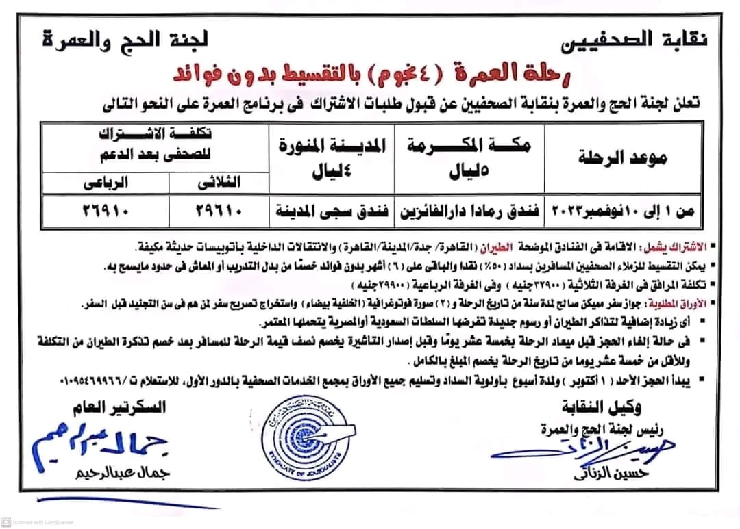 وأشار الزناتي إلى أن مجلس النقابة وافق في اجتماعه الأخير بناء علي طلب تقدم به للمجلس لدعم رحلات العمرة بنسبة 10٪ لأعضاء النقابة من الصحفيين من السعر المتعاقد عليه بحد أقصى ٤آلاف جنيه على أن يستفيد منها العضو مرة واحدة.