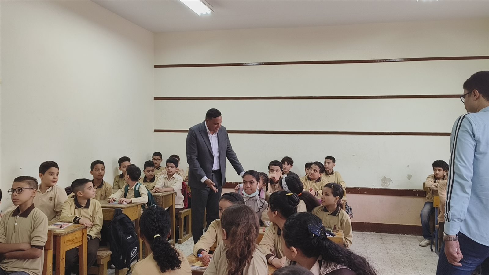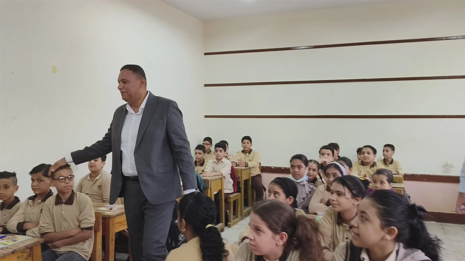 قام الدكتور أيمن مختار محافظ الدقهلية، بإنزال الحقيبة المدرسية من كتف تلميذة داخل الفصل ووضعها بجوارها، ومحاولة تهدئتها في أول أيام الدراسة.