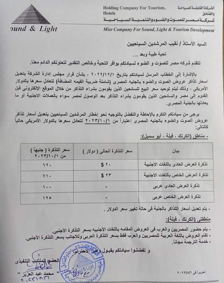 وقالت شركة مصر للصوت والضوء والتنمية السياحية في إخطارها إلى غرفة شركات السياحة ونقابة المرشدين السياحيين، إنه تم تعديل بعض فئات أسعار تذاكر عروض الصوت والضوء بالجنيه المصري لتعادل سعرها بالدولار حاليًا.