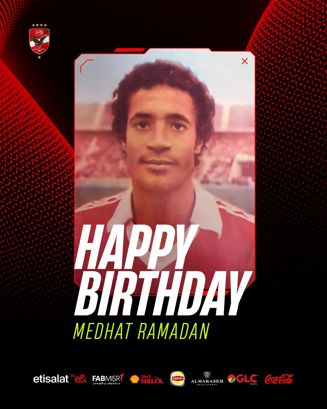 الأهلى، حرص الحساب الرسمي للنادي الأهلي عبر موقع التواصل الاجتماعي فيس بوك على الاحتفال بعيد ميلاد مدحت رمضان نجم الفريق الأول لكرة القدم بالنادي السابق الذي احتفل بعيد ميلاده الـ65 اليوم الأحد فهو من مواليد الأول من شهر أكتوبر من العام 1958 بمدينة طنطا بمحافظة الغربية.