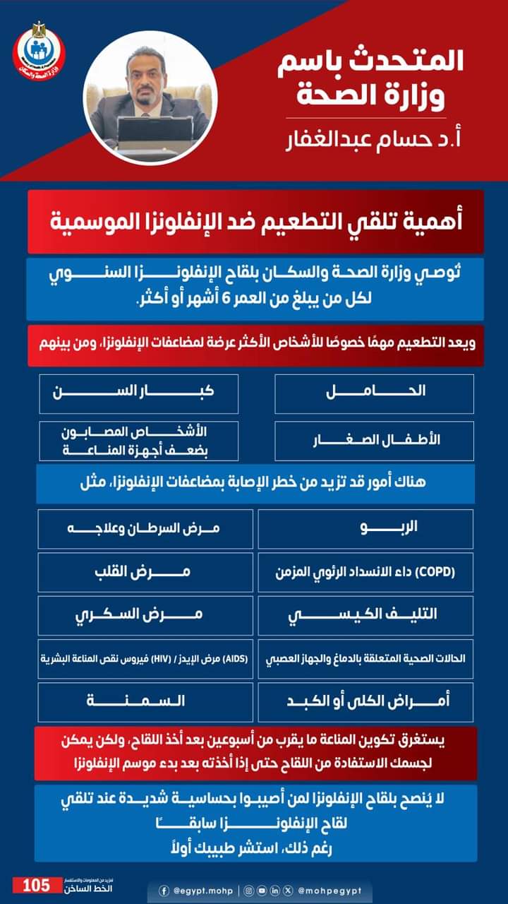 كشف الدكتور حسام عبد الغفار المتحدث باسم وزارة الصحة أن وزارة الصحة والسكان توصي بتناول لقاح الإنفلونزا السنوي لكل من يبلغ من العمر 6 أشهر أو أكثر.