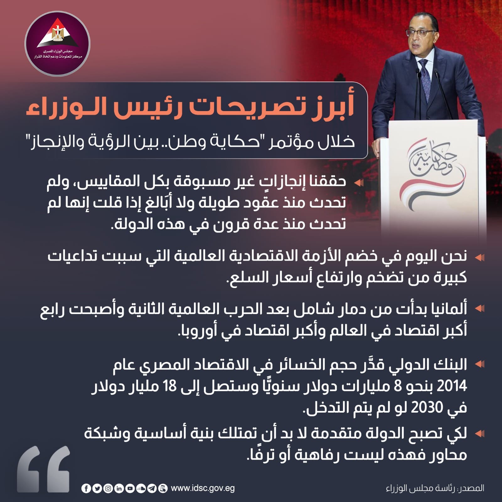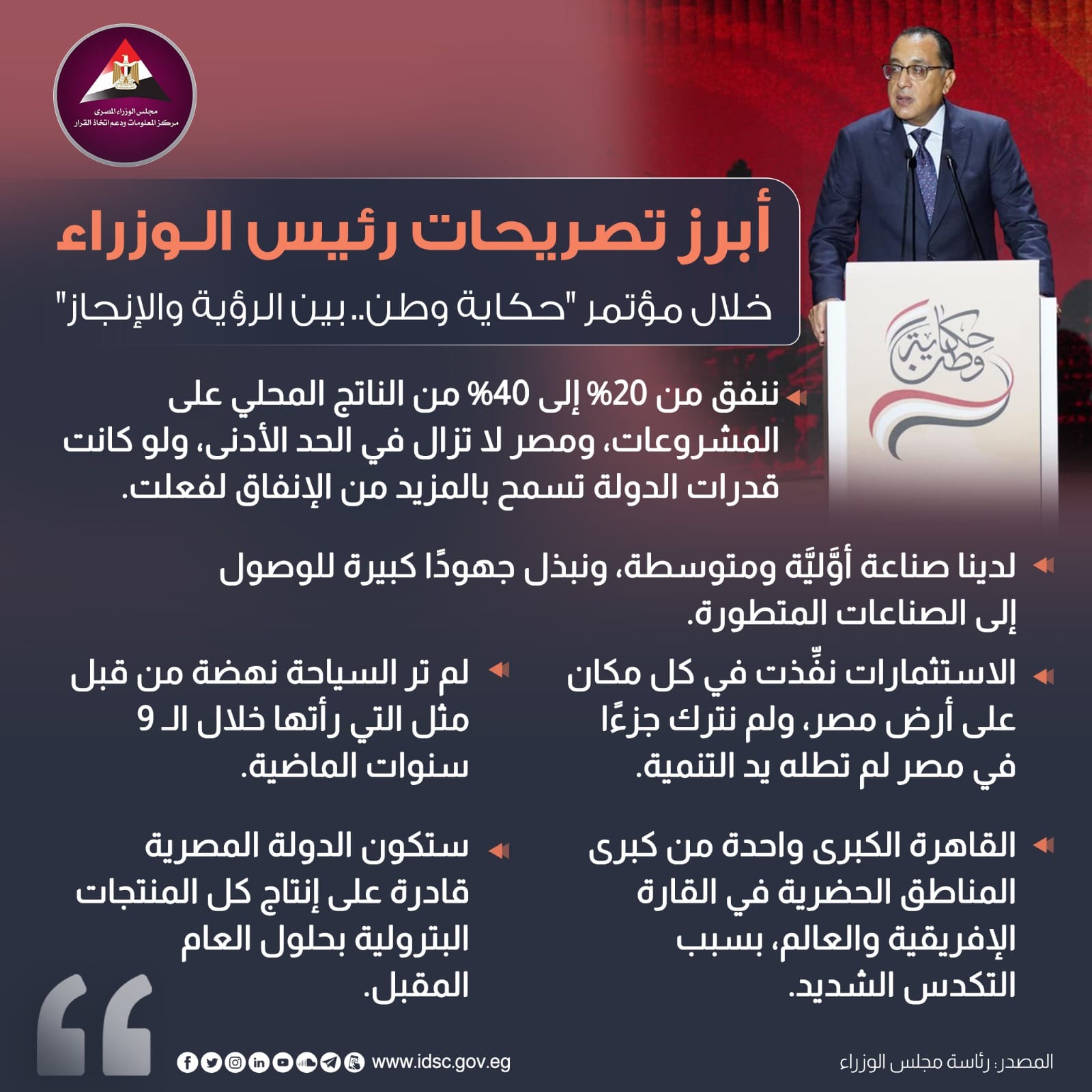 نشرت الصفحة الرسمية لمركز المعلومات ودعم اتخاذ القرار على موقع التواصل الاجتماعي فيسبوك انفوجراف جديدا تحت عنوان (أبرز تصريحات رئيس الوزراء خلال مؤتمر حكاية وطن.. بين الرؤية والإنجاز)