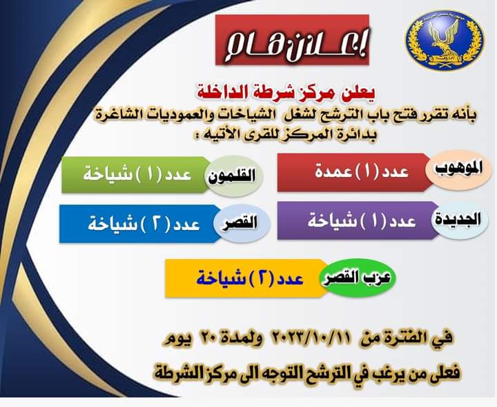 أعلن مركز شرطة الداخلة بمحافظة الوادي الجديد، عن فتح باب الترشح لشغل الشياخات والعموديات الشاغرة بدائرة المركز.