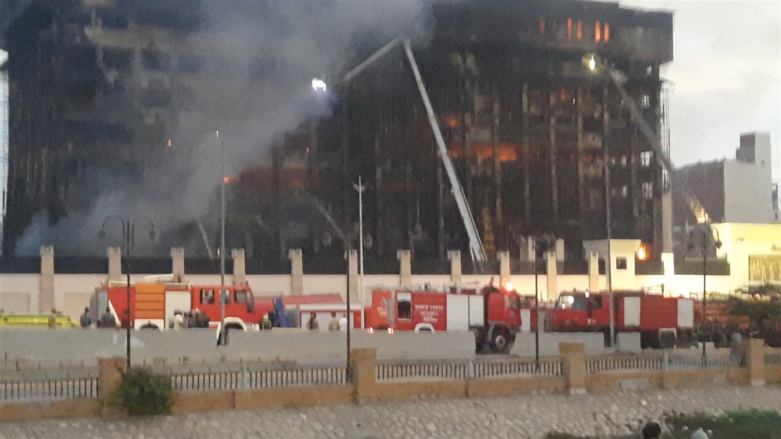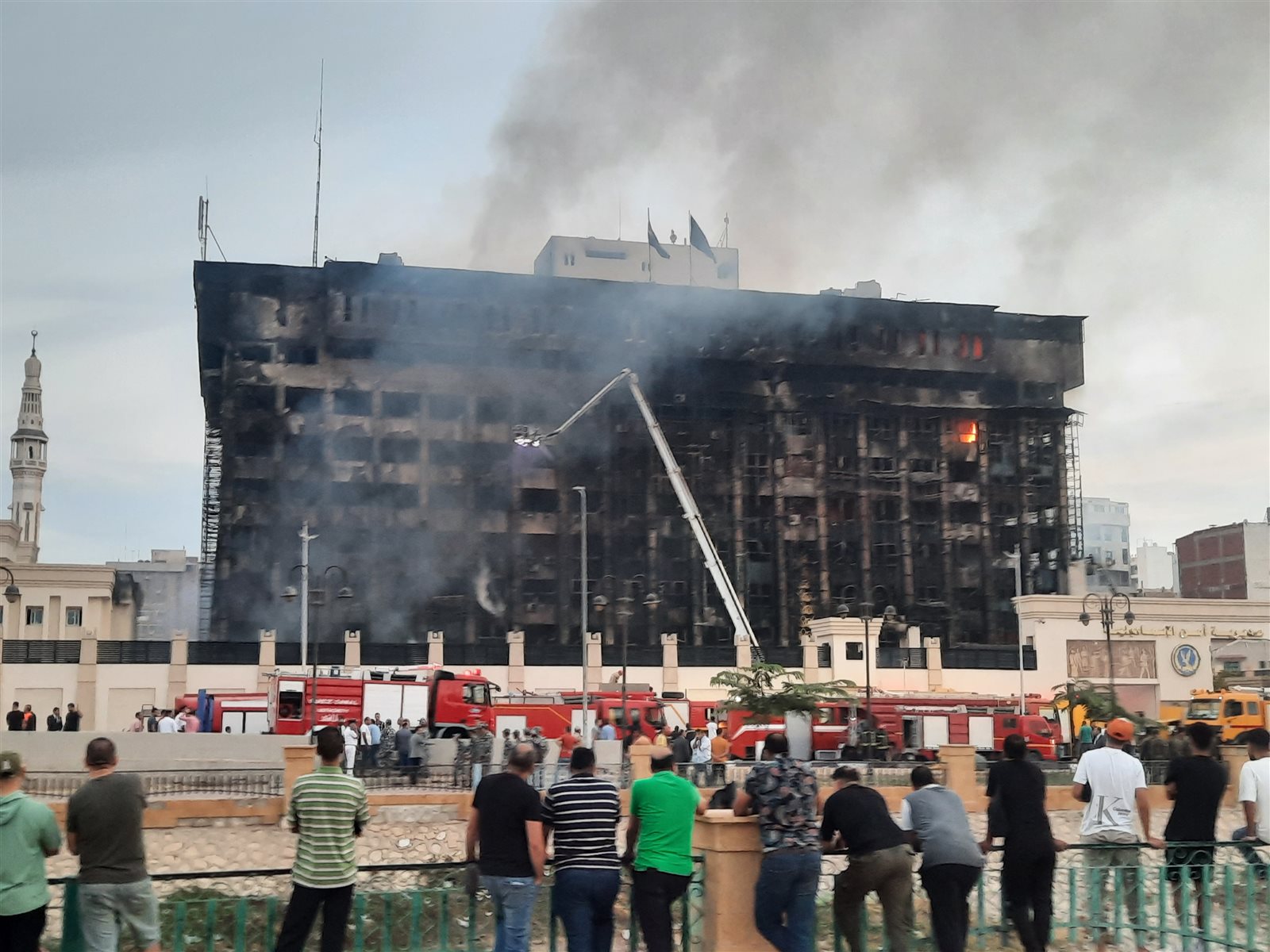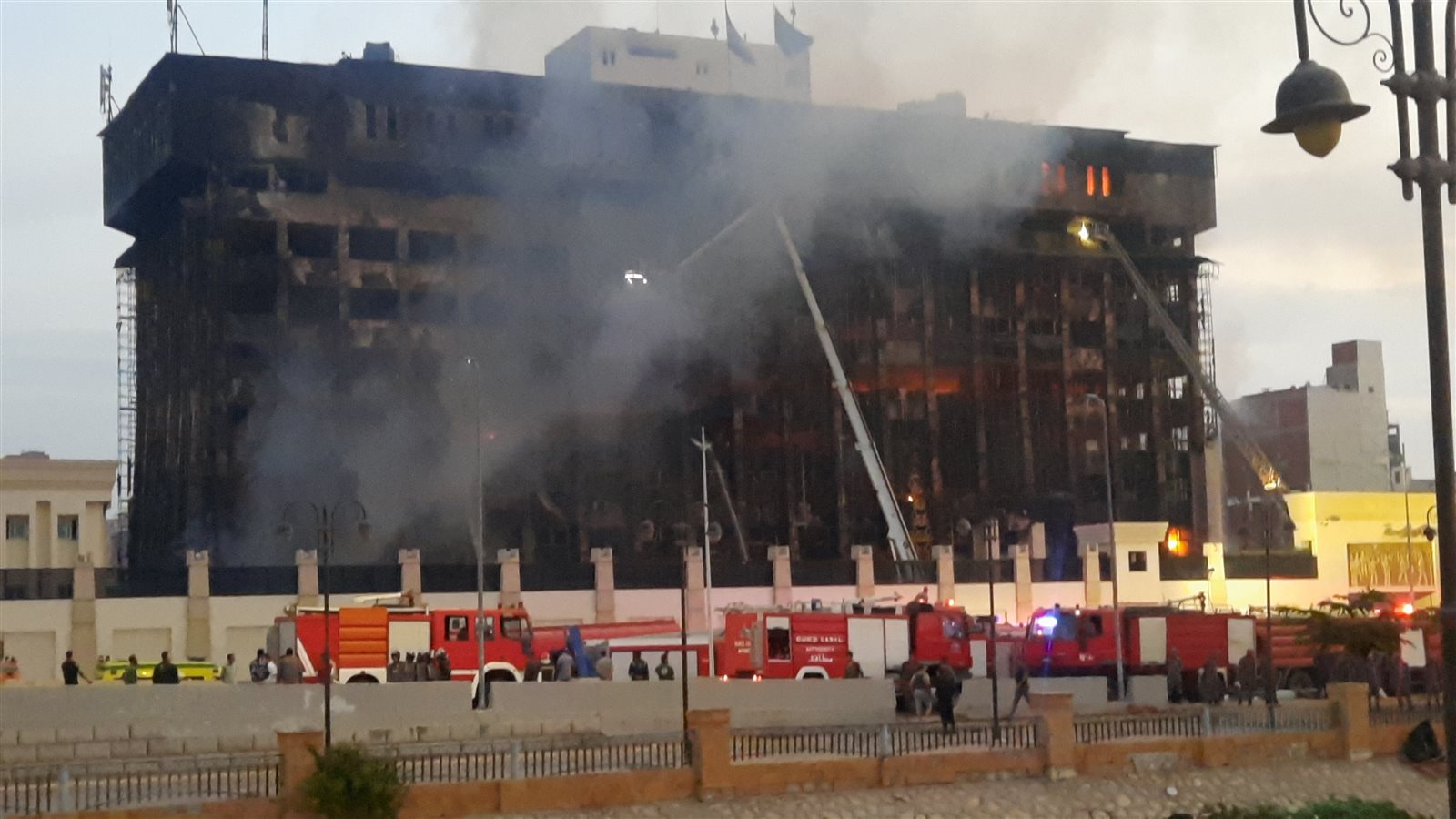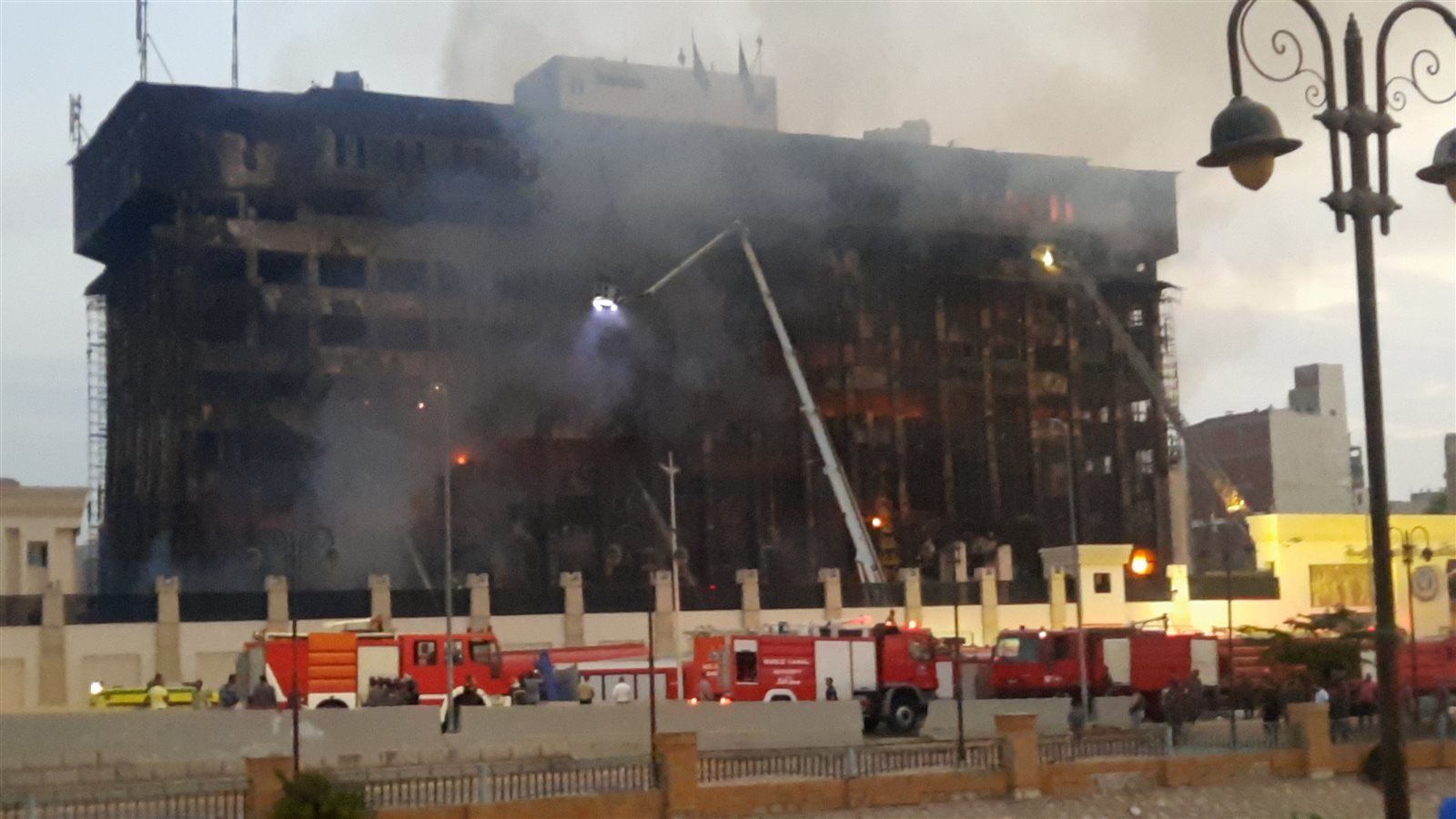 قوات الحماية المدنية تواصل جهودها لإخماد حريق مديرية أمن الإسماعيلية (فيديو)