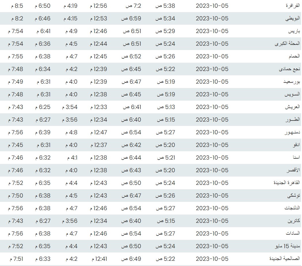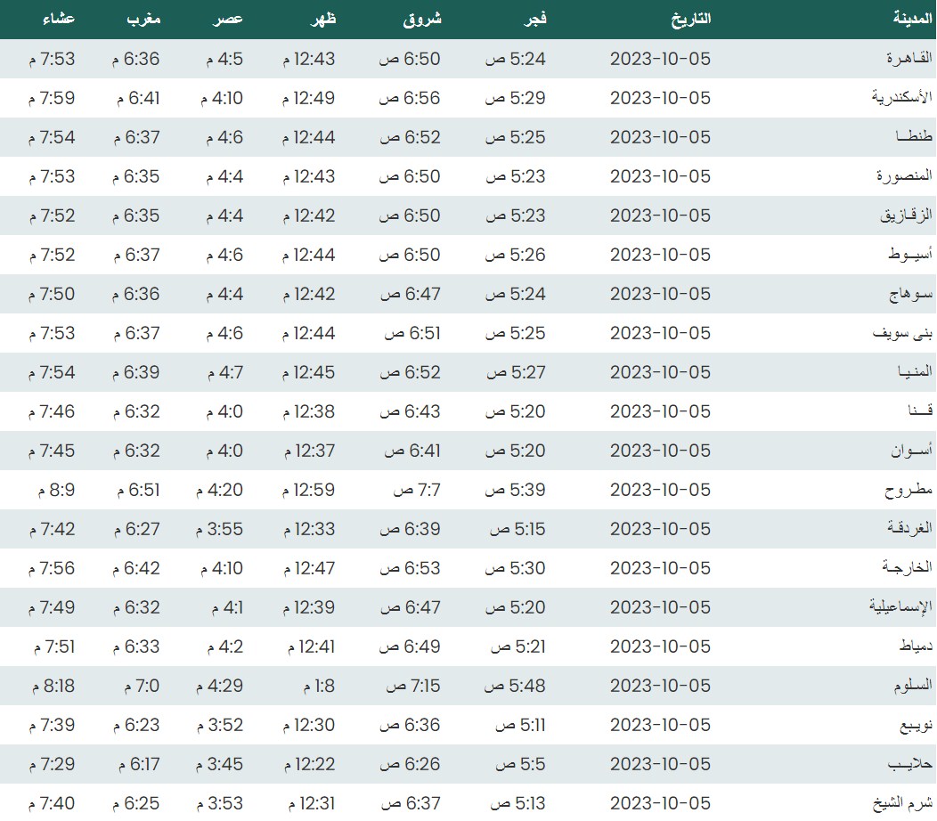 مواقيت الصلاة اليوم وفقًا للتوقيت المحلي لمدينتي القاهرة والإسكندرية وكذلك،مواقيت الصلاة، لعدد من مدن ومحافظات الجمهورية من واقع بيانات الهيئة العامة للمساحة