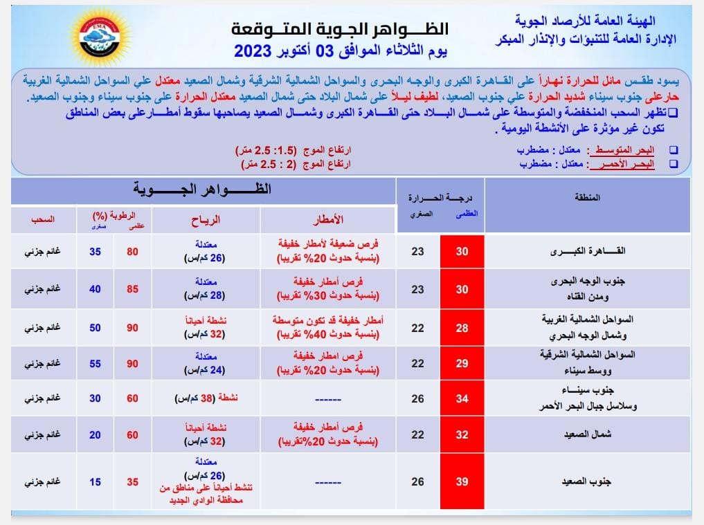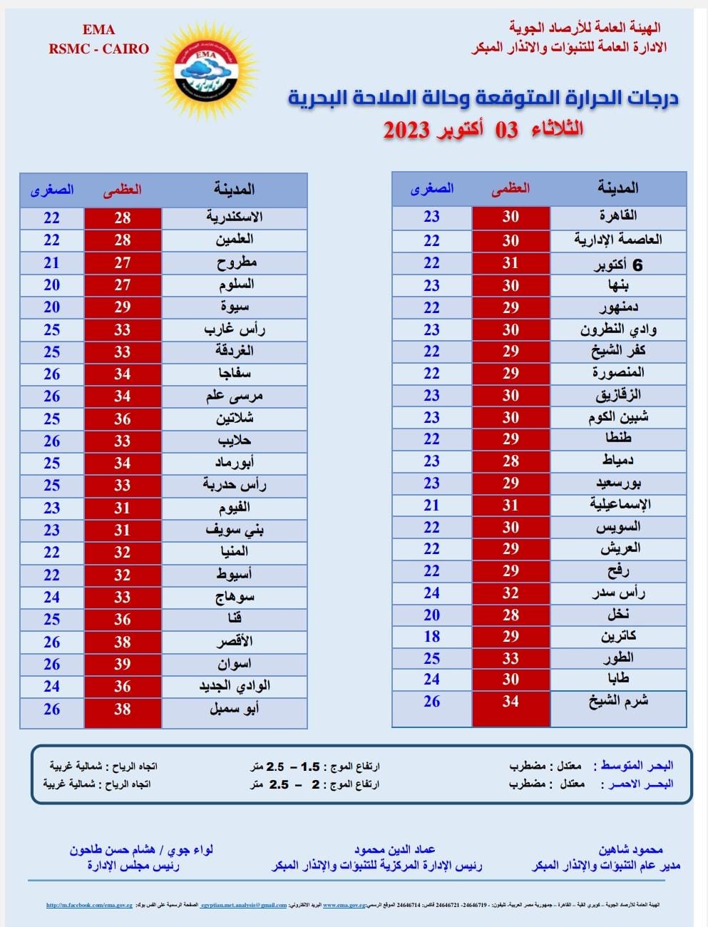 من المتوقع أن تسجل القاهرة الكبرى اليوم ٣٠ درجة مئوية، السواحل الشمالية ٢٨ درجة مئوية، شمال الصعيد ٣٢ درجة مئوية أما جنوب الصعيد ٣٩ درجة مئوية.