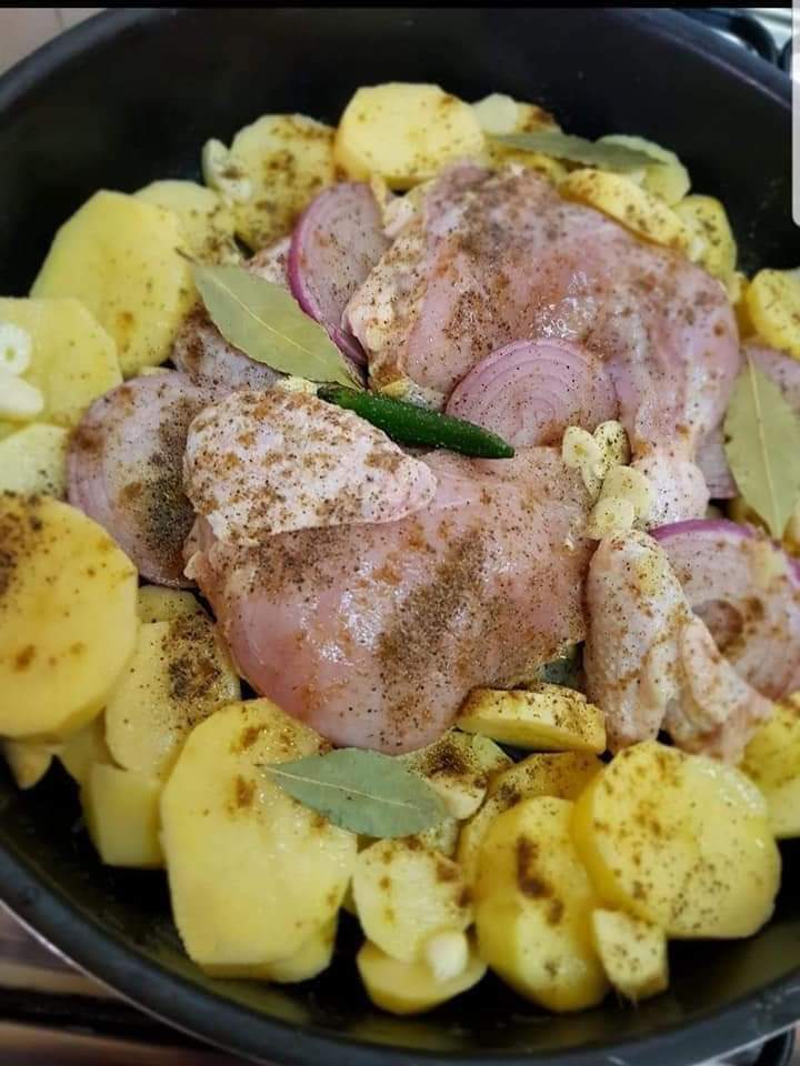 ▪نضع حلقات البطاطس على الدجاج، وباقي البهارات والتوابل، ومرقة الدجاج، وكوب ماء مغلي، ونقلبهم جيدًا.