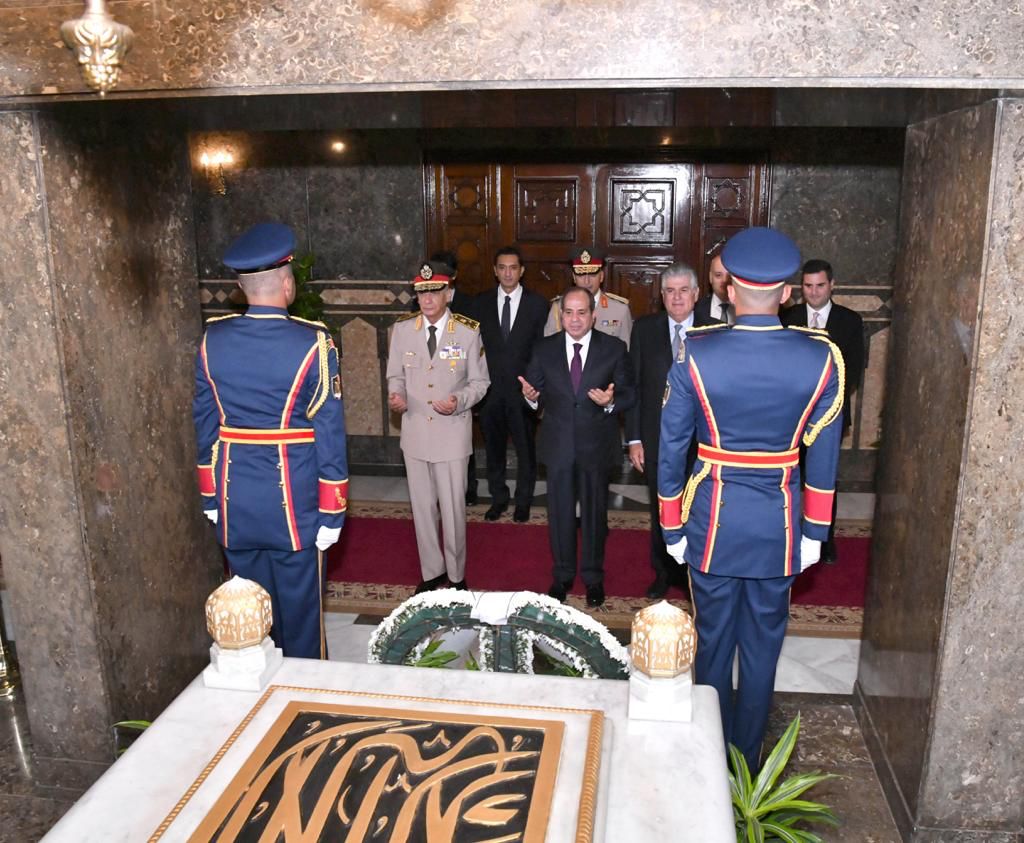 كما وضع الرئيس السيسي أكليل من الزهور على قبري الرئيس السادات والرئيس جمالع عبد الناصر كما قرأ الفاتحة على أرواحهم الطاهرة.