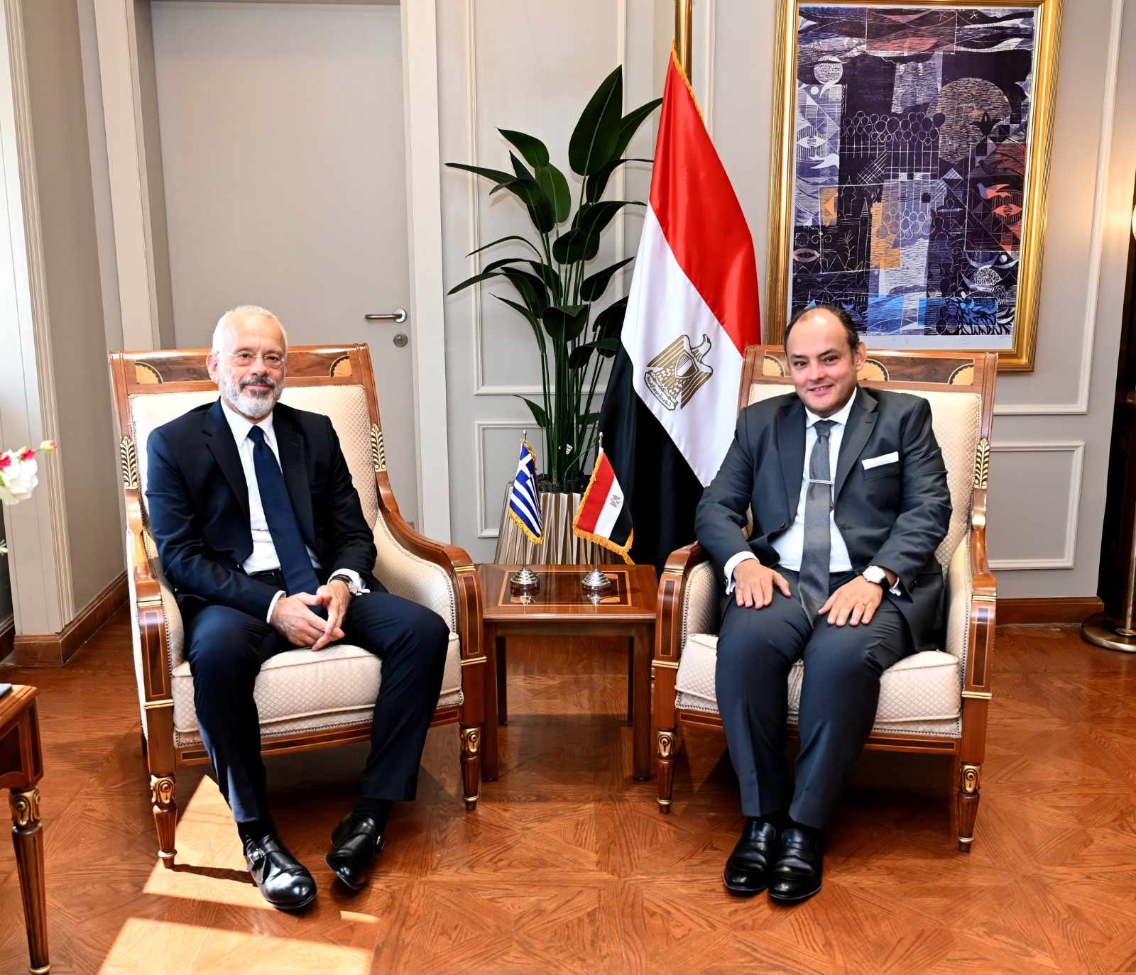 عقد المهندس أحمد سمير وزير التجارة والصناعة لقاءً مع نيكولاس باباجيورجيو، سفير اليونان بالقاهرة، حيث بحث اللقاء سبل تعزيز العلاقات الاقتصادية الثنائية بين البلدين وإمكانيات زيادة معدلات التجارة البينية والاستثمارات المشتركة بين مصر واليونان خلال المرحلة المقبلة.
