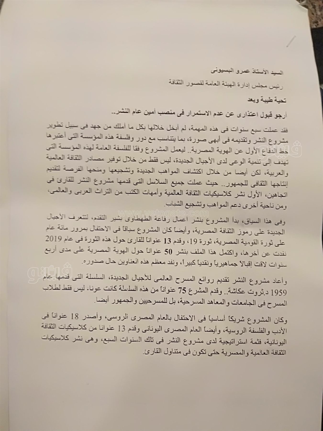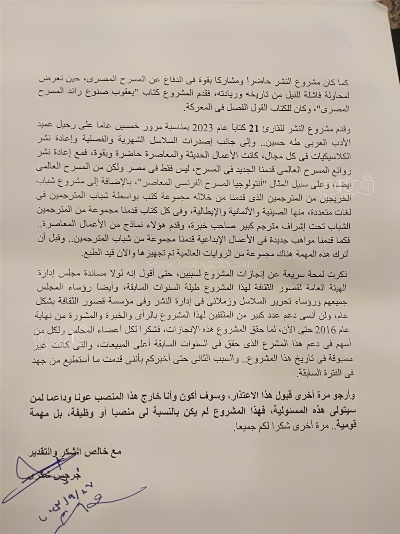 أمين عام النشر بقصور الثقافة يعتذر عن عدم الاستمرار في منصبه