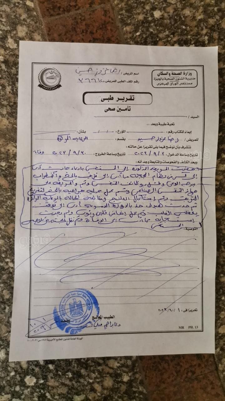 وأضاف التقرير الذي حصلت فيتو على نسخة منه، تم عمل جراحية بالمخ لتفريغ النزيف وتم استكمال العلاج ومتابعة الحالة برعاية الأولية ثم حدث هبوط حاد في الدورة الدموية الداء إلى توقف بعضلة القلب وتم عمل إنعاش قلبي رئوي ولم يحدث استجابة مما أدى إلى الوفاة وتم نقل الجثة إلى مشرحة زينهم.