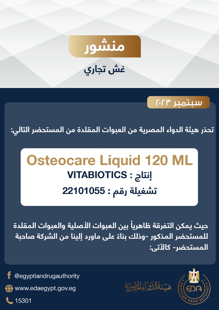 أصدرت هيئة الدواء المصرية منشورا تحذيريا من غش تجاري لمستحضر مكمل غذائي اوستيوكير والذي يحتوي على فيتامين الكالسيوم والزنك وفيتامين د.