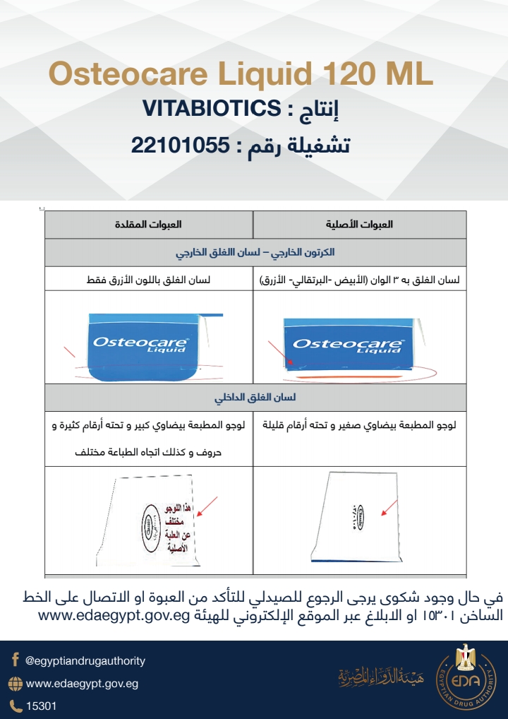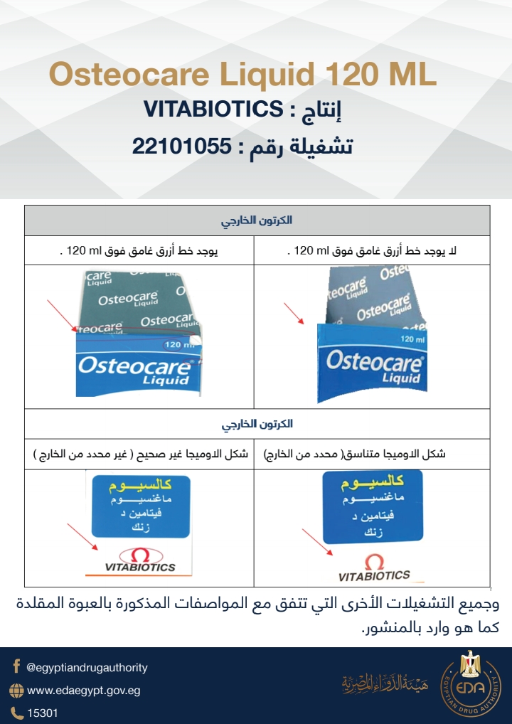 وتضمن المنشور التحذيري الفرق بين العبوات الأصلية والمغشوشة ويستخدم فيتامين اوستيوكير وهو فيتامين واسع الاستخدام في حالات نقص الكالسيوم بالجسم وللسيدات الحوامل.