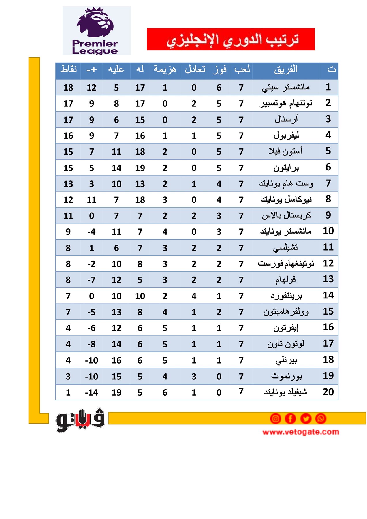 ويتصدر مانشستر سيتي جدول ترتيب الدوري الإنجليزي بفارق نقطة عن توتنهام وأرسنال بعد الجولة السابعة لمسابقة الدوري الإنجليزي الممتاز.
