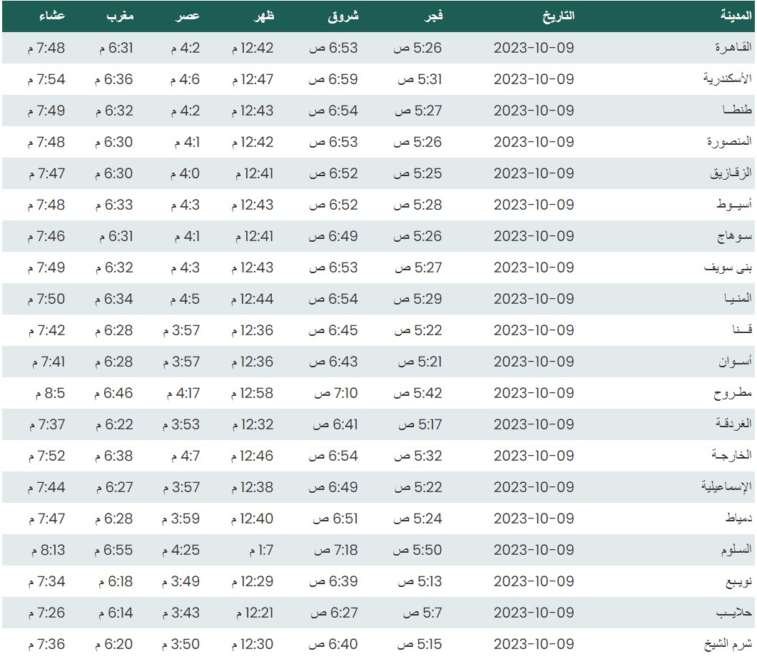 مواقيت الصلاة اليوم الإثنين 9 - 10 - 2023 في القاهرة والمحافظات