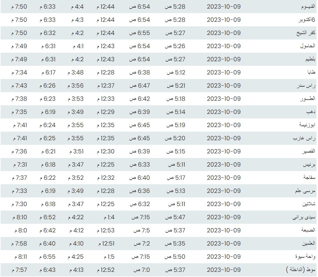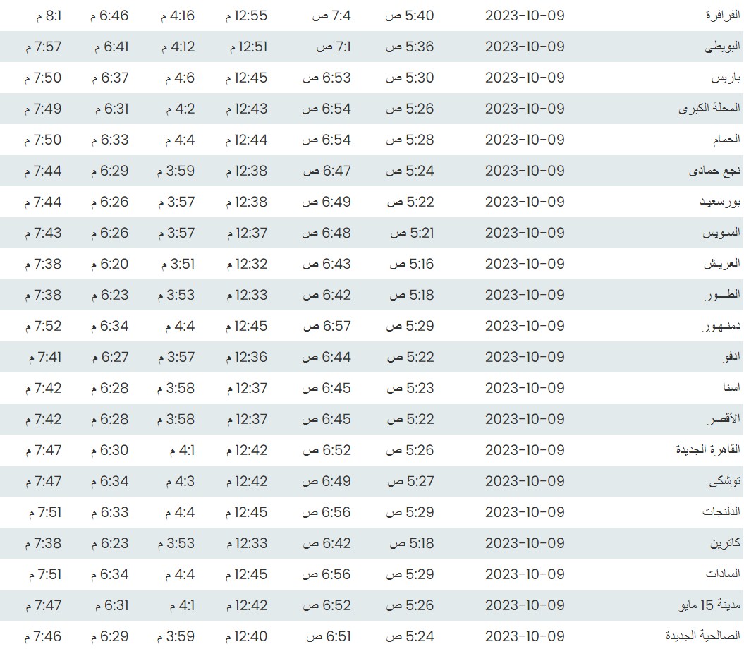 مواقيت الصلاة اليوم وفقًا للتوقيت المحلي لمدينتي القاهرة والإسكندرية وكذلك، مواقيت الصلاة، لعدد من مدن ومحافظات الجمهورية من واقع بيانات الهيئة العامة للمساحة