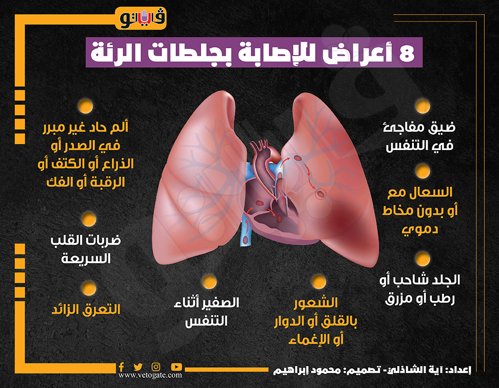 8 أعراض للإصابة بجلطات الرئة (إنفوجراف) الخميس 05/أكتوبر/2023 - 04:29 م 10/5/2023 4:29:49 PM الرئة، فيتو آية الشاذلي شارك طباعة 18 حجم الخط شارك طباعة أعراض جلطات الرئة ألم في الصدر جلطات الرئة ضربات القلب السريعة ضيق في التنفس ضربات القلب قلق