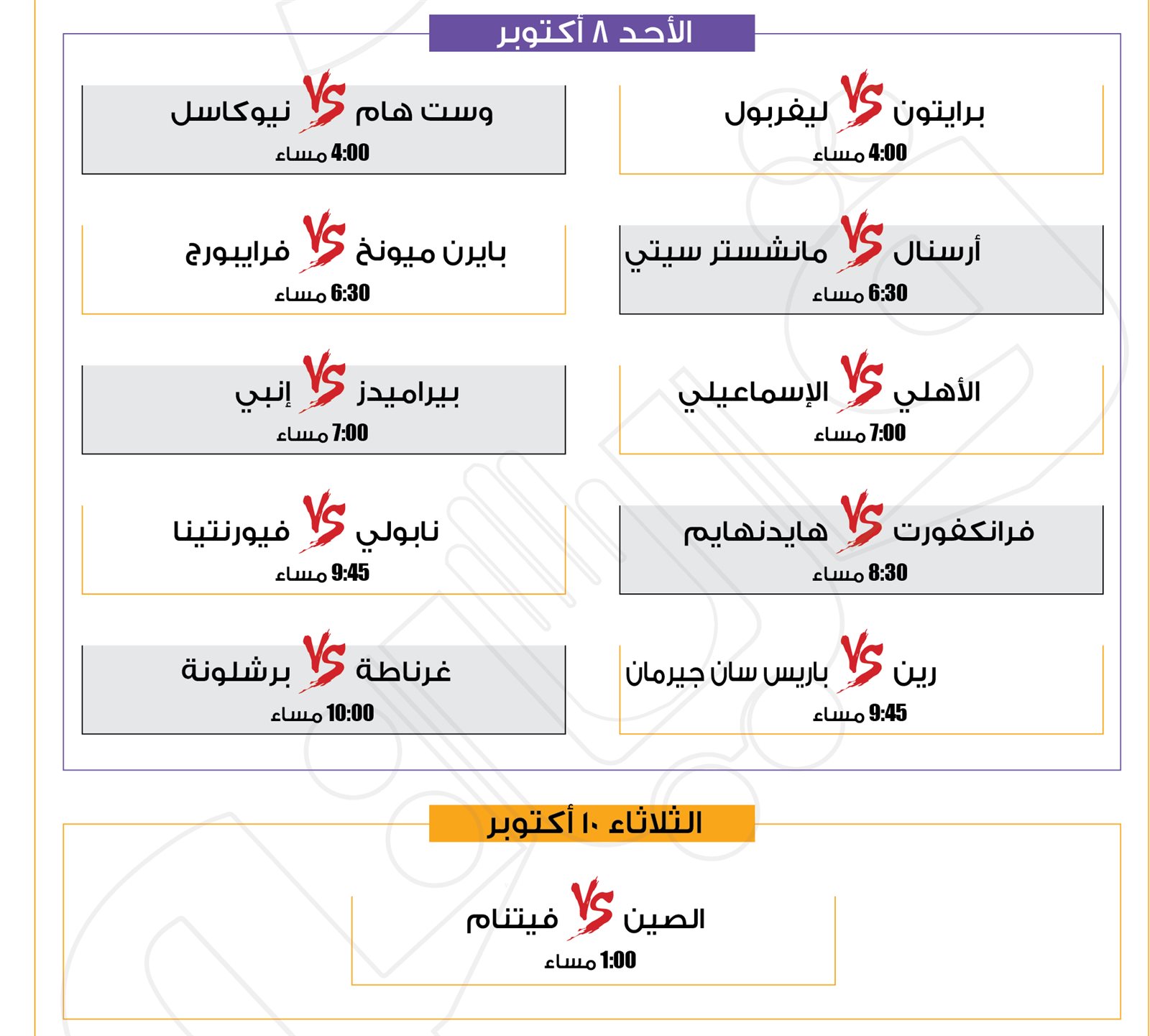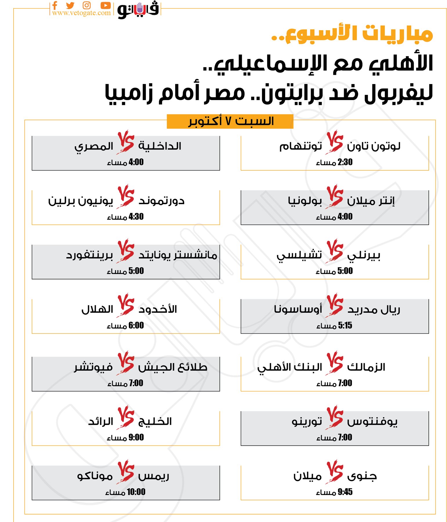 مباريات الأسبوع، الأهلي مع الإسماعيلي.. ليفربول ضد برايتون.. مصر أمام زامبيا (إنفوجراف) السبت 07/أكتوبر/2023 - 09:11 ص 10/7/2023 9:11:37 AM منتخب مصر، فيتو محمد سيد شارك طباعة 18 حجم الخط شارك طباعة الأهلي الزمالك ليفربول الاسماعيلي بيراميدز مصر زامبيا