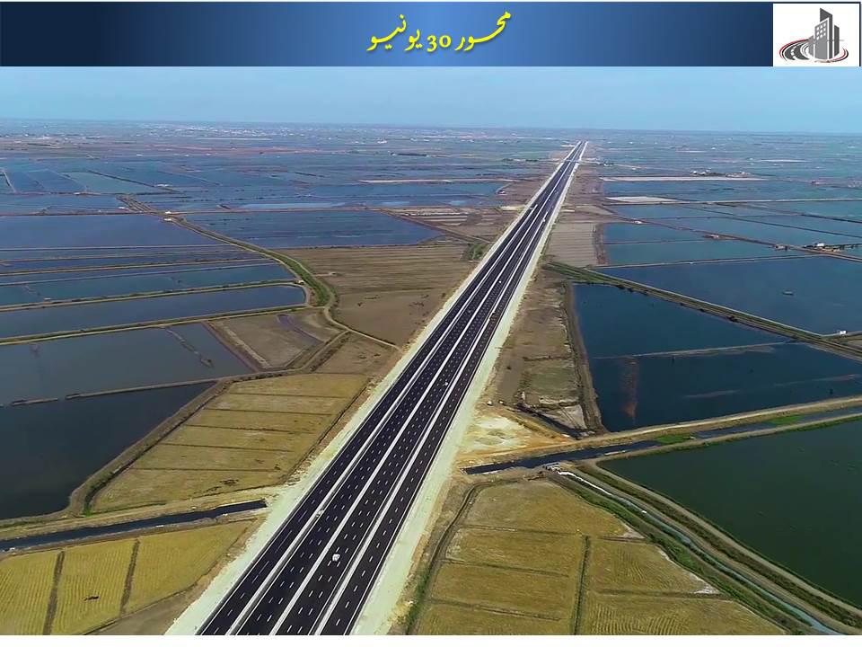 وأضاف رئيس الجهاز المركزى للتعمير: تشمل الطرق المُنفذة، محور 30 يونيو الحر "ضمن مشروعات شبكة الطرق القومية" بطول 95 كم وعرض 80 مترًا، الذى يبدأ من جنوب بورسعيد مارًا بالطريق الدولى الساحلى بورسعيد / دمياط، ويمتد جنوبًا حتى يتقاطع مع طريق القاهرة / الإسماعيلية الصحراوى عند الكيلو 94، ويتكون من (5 – 6 حارات مرورية في كل اتجاه) بالإضافة إلى طريقى خدمة على جانبى المحور لخدمة الكيانات العمرانية القائمة، ويضم المحور (17 كوبرى – 18 نفقًا عرضيًا للسيارات والمشاة – 500 بربخ / عداية / مروى)، ويهدف لزيادة الربط بين سيناء والدلتا مما يساهم فى إسراع معدلات التنمية، ويُعد طريق النقل الرئيسي لخدمة مشروعات تنمية محور قناة السويس، واستيعاب الزيادة فى الحركة المرورية المتوقعة نتيجة تنفيذ هذه المشروعات، وربط موانئ البحر المتوسط بموانئ البحر الأحمر، وتم افتتاحه فى نوفمبر 2019.